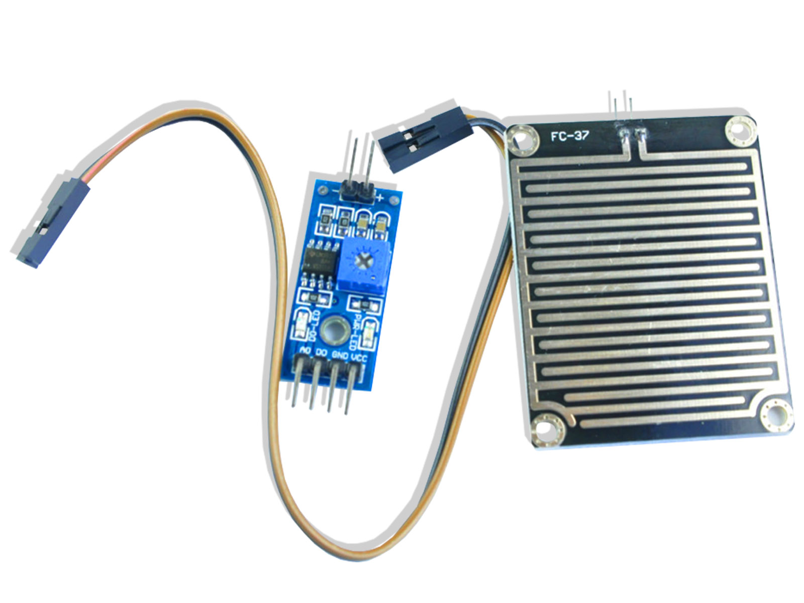 Dwuelementowy moduł czujnika deszczu to układ porównujący rezystancję sondy z wcześniej ustaloną wartością (sterownik). Woda na płytce sondy (deszcz czy śnieg) powoduje spadek rezystancji pomiędzy ścieżkami sondy, co jest odczytywane przez układ sterownika. Na sterowniku znajduje się potencjometr oraz dioda sygnalizująca stan wyjścia.