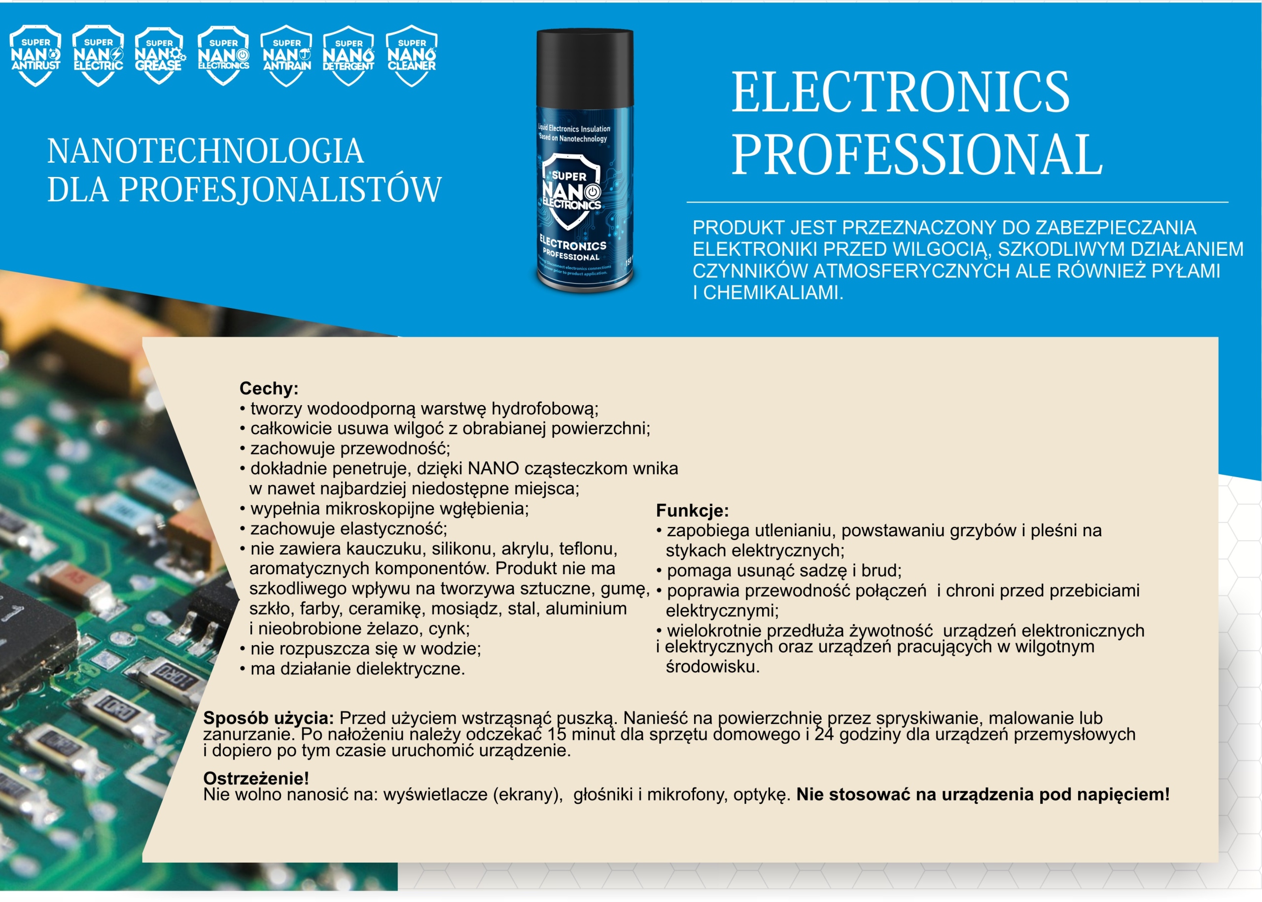 Super Nano Electronics to profesjonalny środek zabezpieczający czułe elementy elektroniki przed wilgocią i deszczem. Produkt przywraca przewodnictwo elektryczne i zdolność pracy w elementach, które już zamokły. Dzięki niemu możliwe jest wydłużenie żywotności urządzeń oraz ich dłuższą eksploatację. Opakowanie zawiera 150 ml płynu, przeznaczonego do rozpylenia.