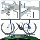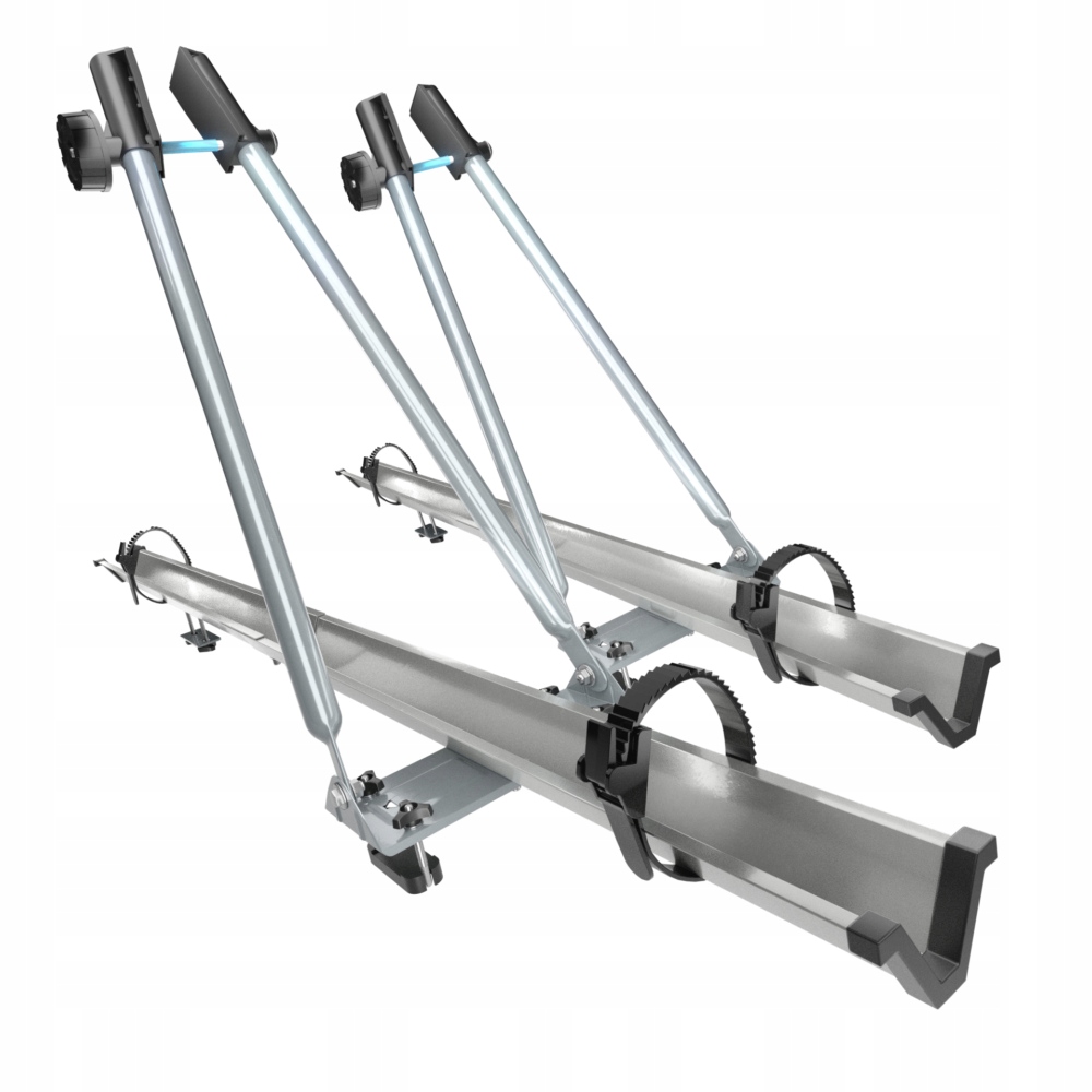 Praktyczny aluminiowy (z elementami ze stali i tworzywa) uchwyt do przewożenia rowerów przeznaczony jest do montażu na bagażniku dachowym auta (belkach).