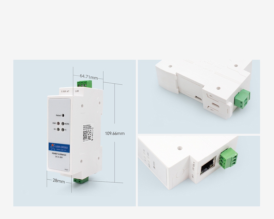 USR-DR302 to przemysłowy media konwerter RS232 na LAN w obudowie do montażu na szynie DIN. Urządzenie zapewnia przeźroczystą transmisję danych. Obsługuje protokół Modbus RTU oraz TCP IP.