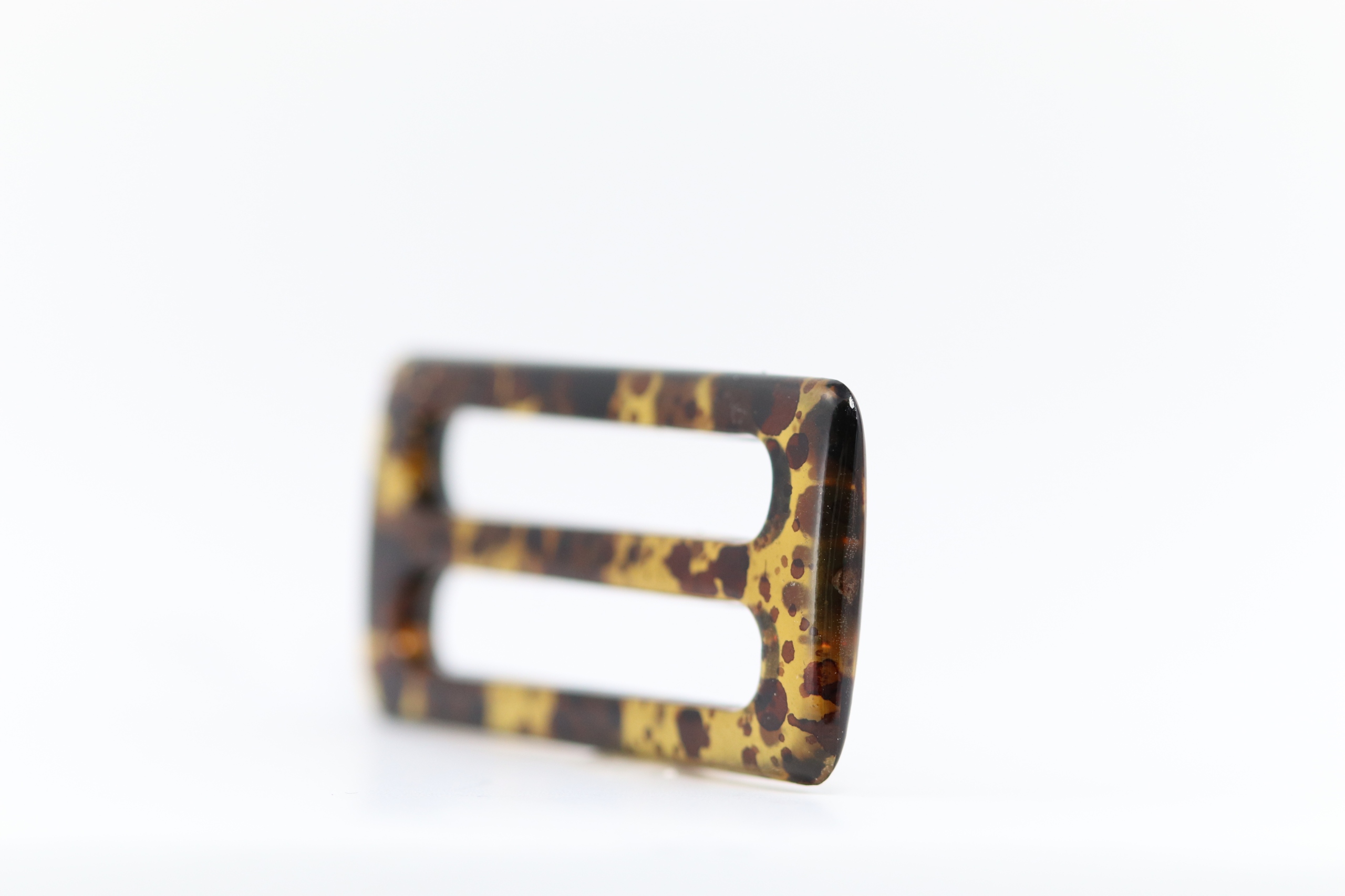 Klamra regulacyjna wykonana z wysokiej jakości plastiku, o przezroczystej żółtej barwie z brązowymi kropkami.