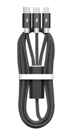 Postaw na uniwersalny i funkcjonalny kabel o mocy 2A, który ma aż trzy wtyczki - micro USB, lightning i typ C. Dzięki takiej konstrukcji możesz ładować aż trzy różne urządzenia jednocześnie