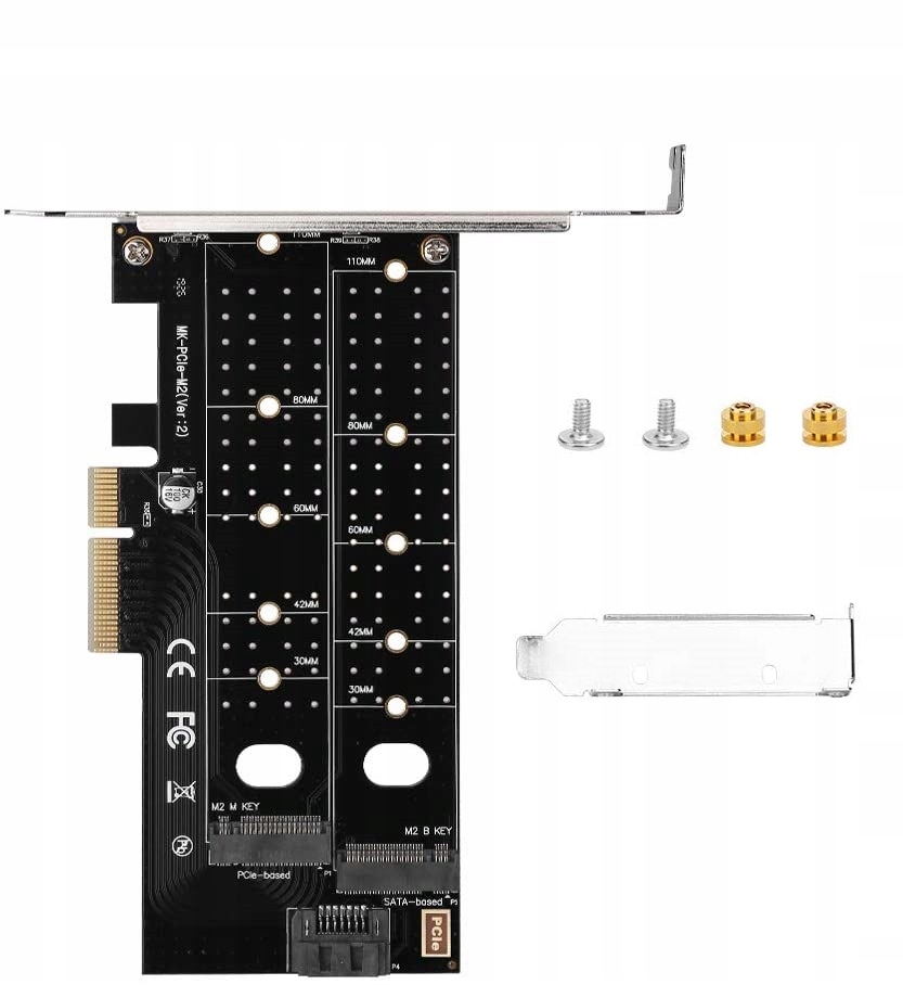 Dysk posiada po 1 złączu na dany interfejs dysku M.2. Dysk M.2 SATA należy podłączyć kablem SATA 7 pin z płytą główną (brak w zestawie) a dysk M.2 NVMe łączy się z płytą główną przez złącze PCI-E x4 w adapterze. 2 dyski są podłączone do płyty głównej w różny sposób, dzięki temu mogą działać 2 jednocześnie zajmując tylko 1 miejsce w obudowie i 1 złącze PCI-E na płycie głównej.