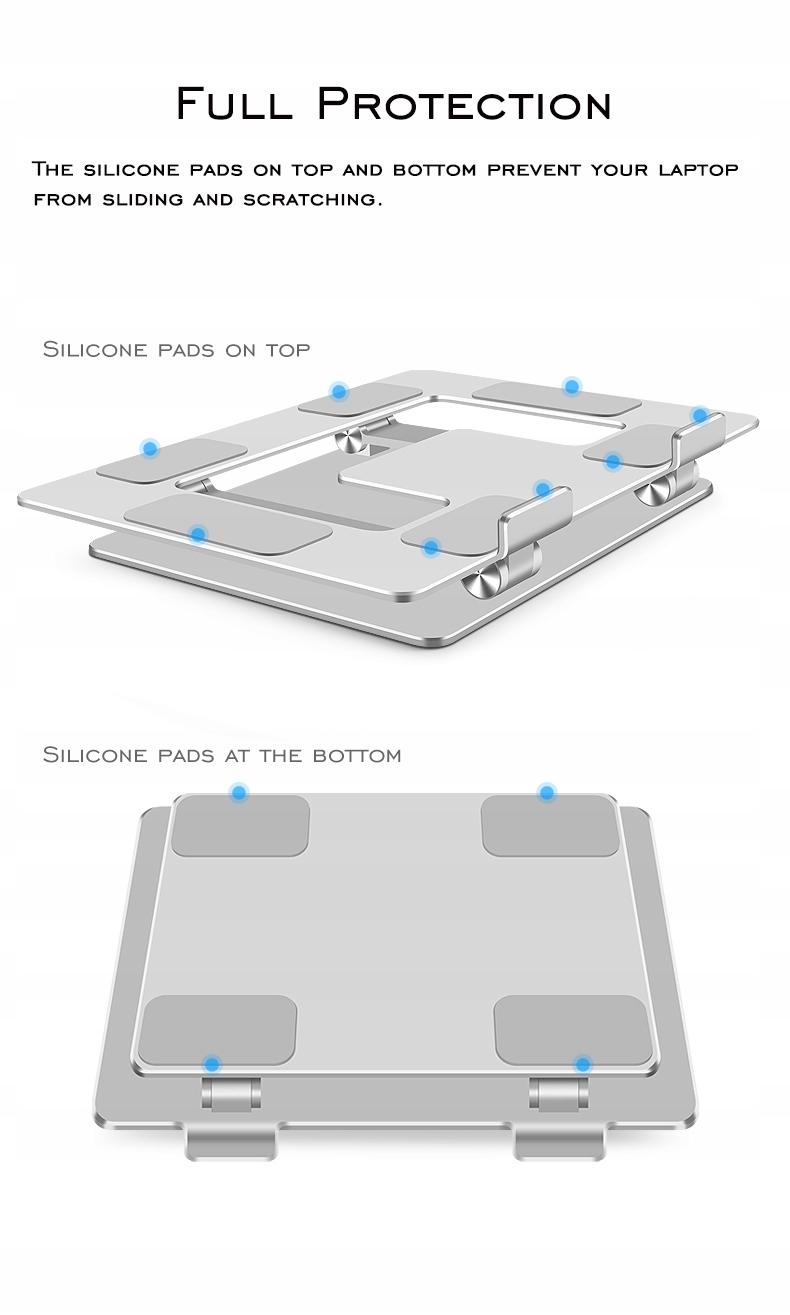 Produkt wyposażony został w silikonowe podkładki anty poślizgowe zamontowane zarówno na podstawie urządzenia, jak i na podstawce stabilizującej laptop.