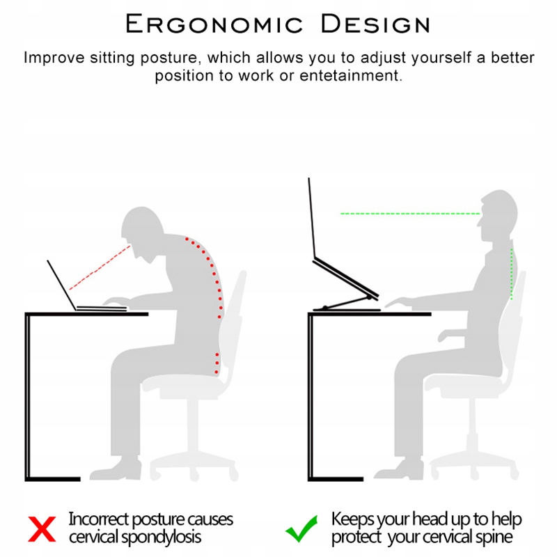 Ważnym czynnikiem ergonomii pracy przy komputerze jest ustawienie monitora, niestety laptopy nie posiadają takiej możliwości przez co w trakcie pracy jesteśmy narażeni na ciągłe garbienie się. Co może powodować bóle kręgosłupa w odcinku szyjnym. Dzięki zastosowaniu podstawki pod laptopa DAC ProDesk nasza praca stanie się bardziej komfortowa.
