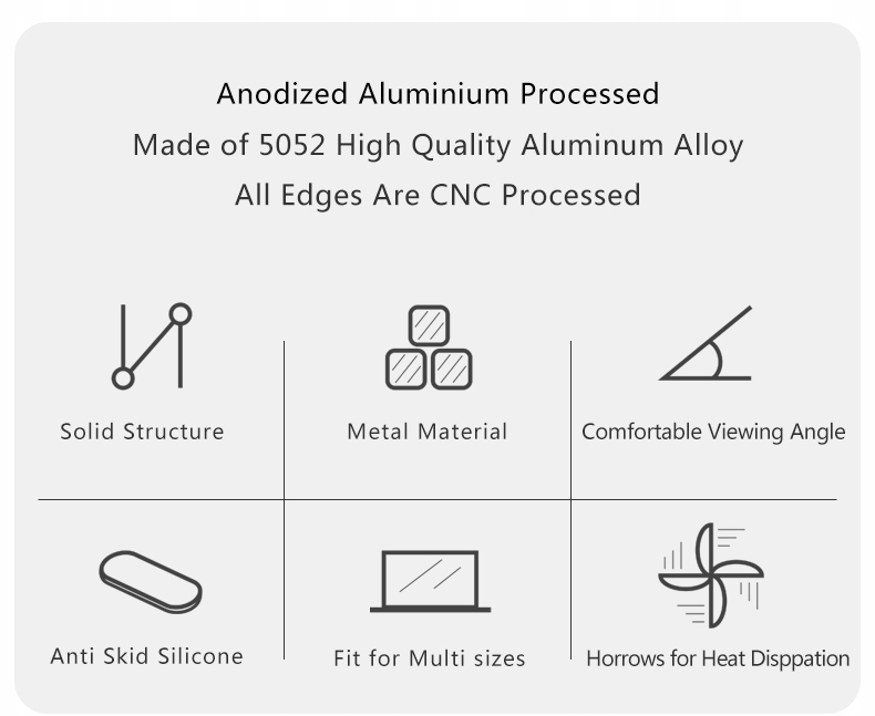 Изделие изготовлено из высококачественного алюминия, который поверхность была дополнительно усилена анодированием. Благодаря такому применению продукт он выглядит эксклюзивно и стильно, а также отлично отводит тепло от нашего компьютера использование специальных вентиляционных отверстий.