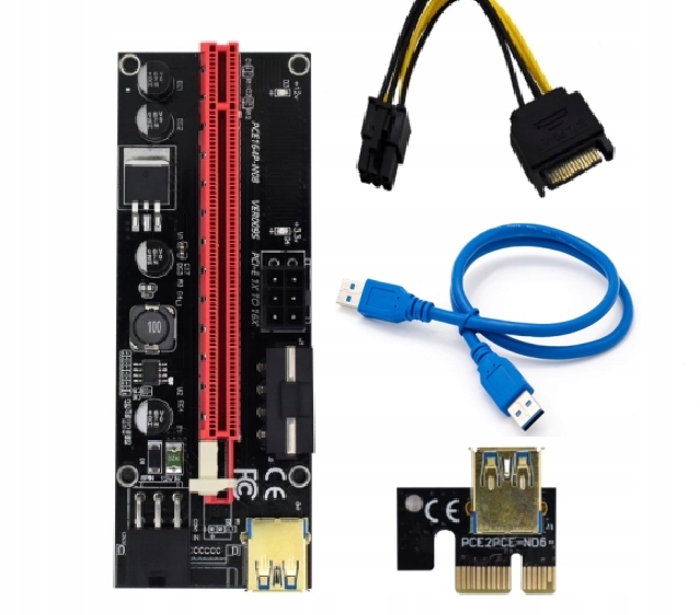 Riser posiada gniazdo żeńskie PCI-E 16x,wejście USB 3.0 oraz wejście na zasilanie 6PIN, Sata oraz molex 4 pin.