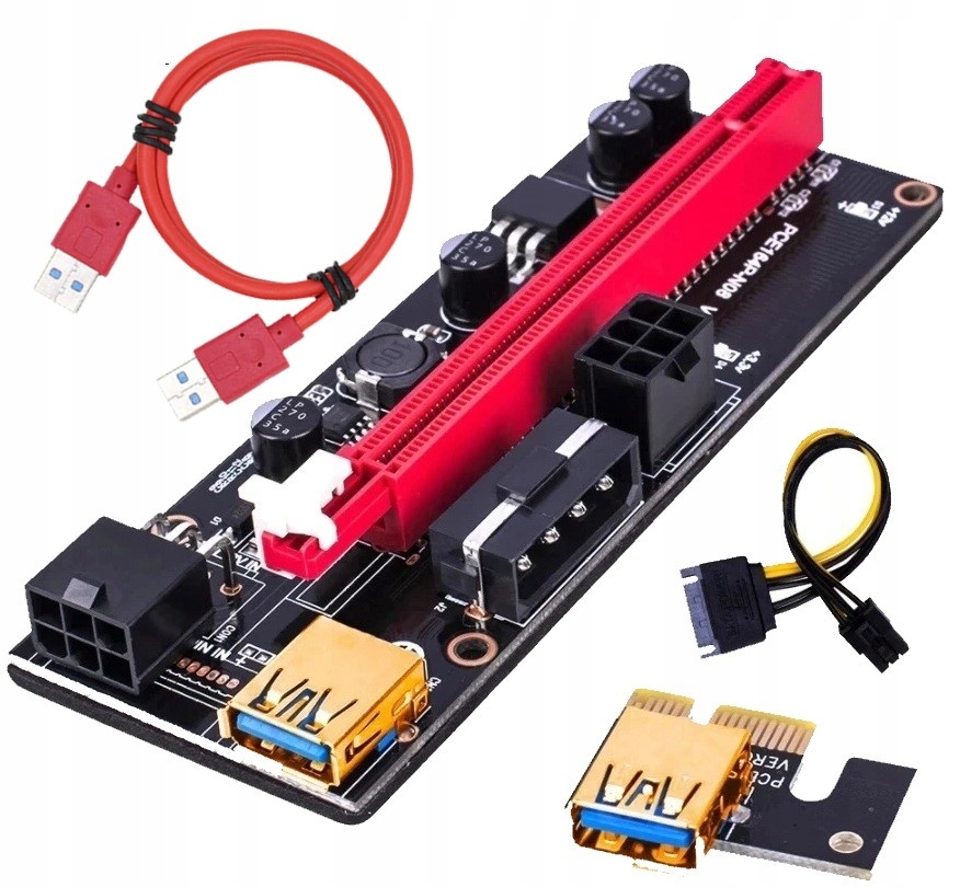 Riser posiada gniazdo żeńskie PCI-E 16x,wejście USB 3.0 oraz wejście na zasilanie 6PIN, Sata oraz molex 4 pin.
