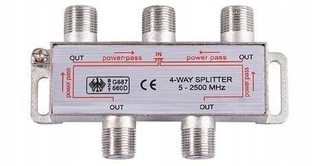 Wysokiej jakości małostratny ekranowany splitter, (rozgałęźnik sygnału telewizyjnego), posiadający 1 wejście i 4 wyjścia.Splitter pracuje w zakresie 5-2500 MHz. Doskonale nadaję się do rozgałęźnika sygnału telewizji naziemniej oraz satelitarnej.