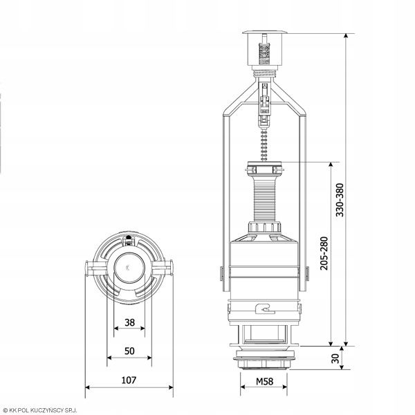 Zawór spustowy dysponuje możliwością nastawienia optymalnej ilości wypuszczanej wody. Umożliwia to – przy zastosowaniu dowolnej ceramiki – ograniczenie ilości zużywanej wody, a jednocześnie utrzymanie toalety w idealnej czystości. Charakteryzuje się dużym zakresem nastawiania wysokości. Może być stosowany w dolnopłukach i ceramice