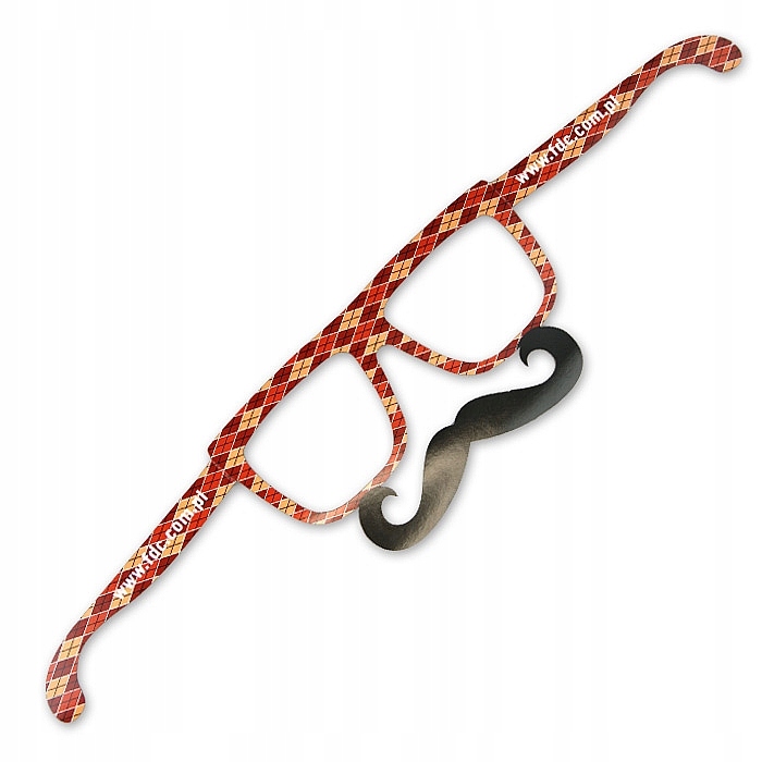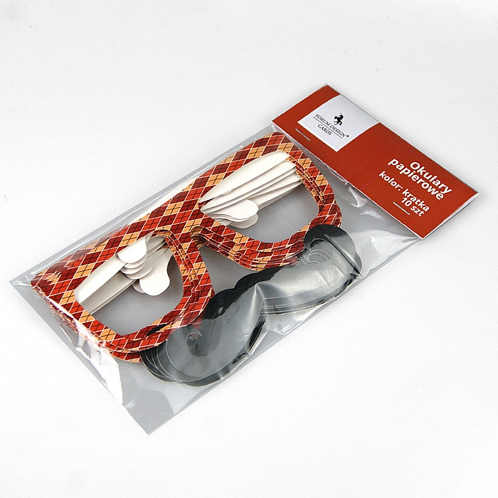 Zabawny gadżet, idealny na szaloną imprezę. Kolorowe okulary z wąsami wykonane z kartonu 230g .Pakowane po 10 szt