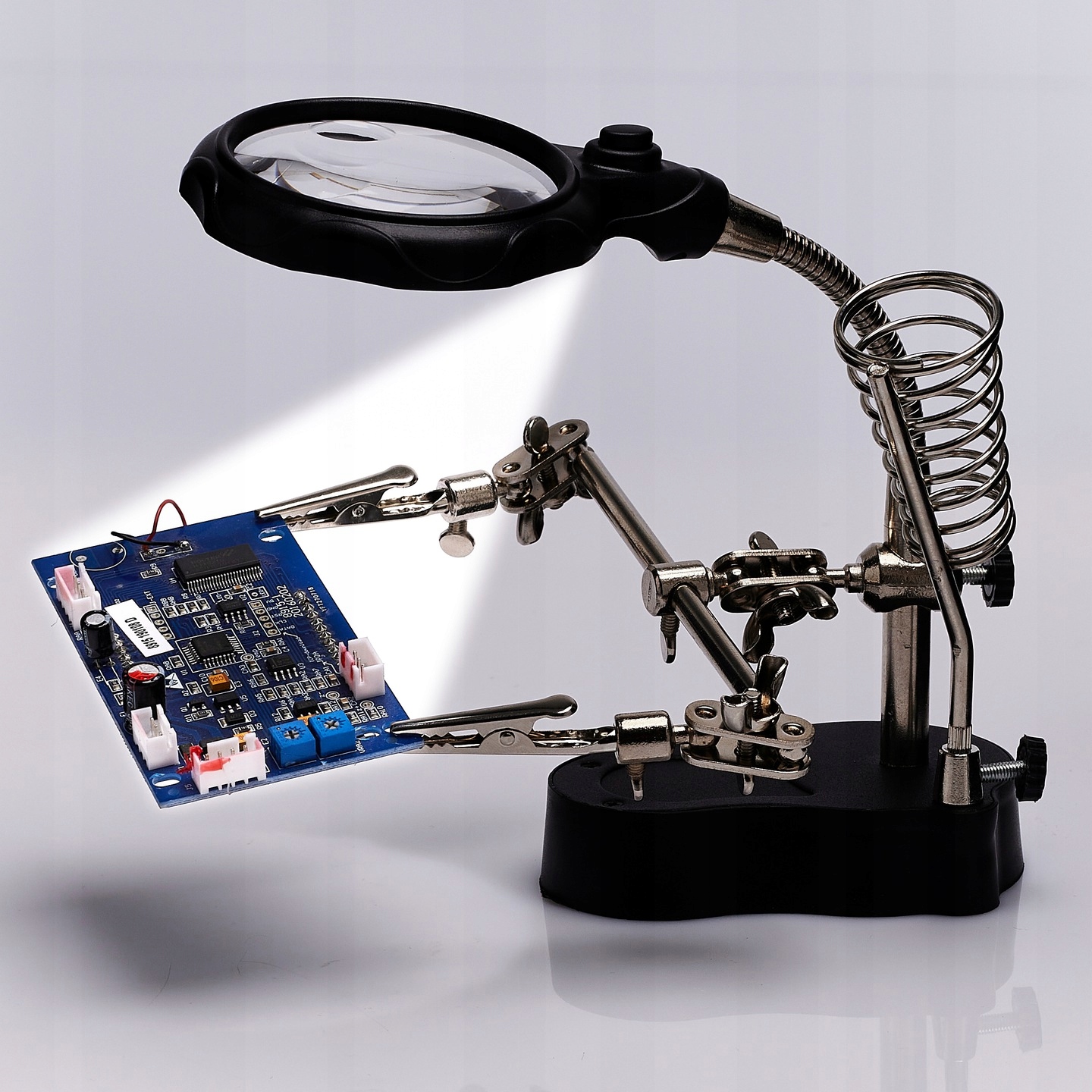 Trzecia Ręka z Lupą oraz podświetleniem LED i uchwytem na lutownicę - ZD-126-2. Lupa z podświetleniem miejsca pracy, oraz stojak na lutownicę znakomicie ułatwiają pracę. W zestawie regulowana lupa z soczewką powiększającą, oraz zamontowanym podświetleniem LED. Dzięki dużemu szkle powiększającemu oraz diodom 2 x LED, obraz jest bardzo wyraźny i czytelny. Może być używana przez Jubilerów, Numizmatyków, Serwisantów elektroniki, zegarmistrzów itp. Idealny zestaw do prac elektronicznych i elektrycznych.