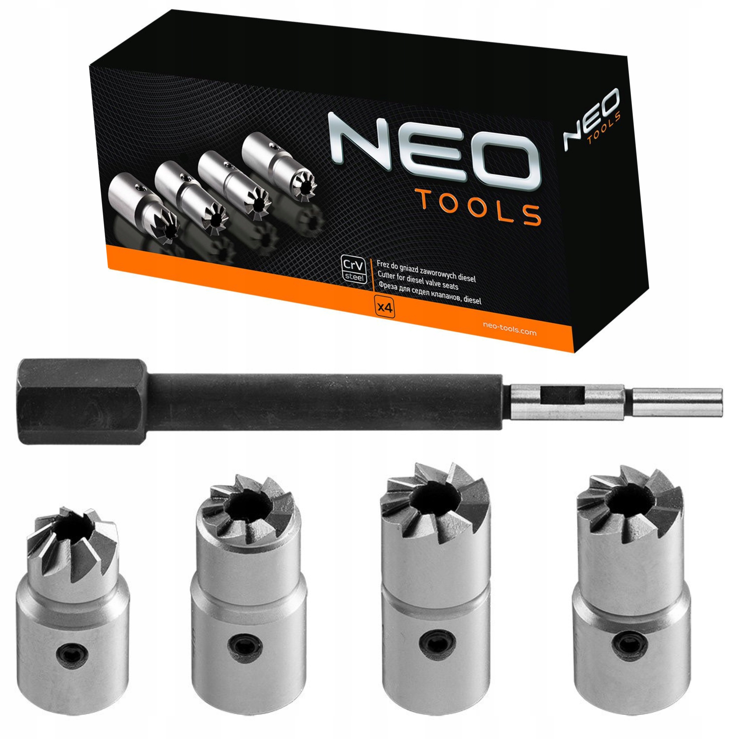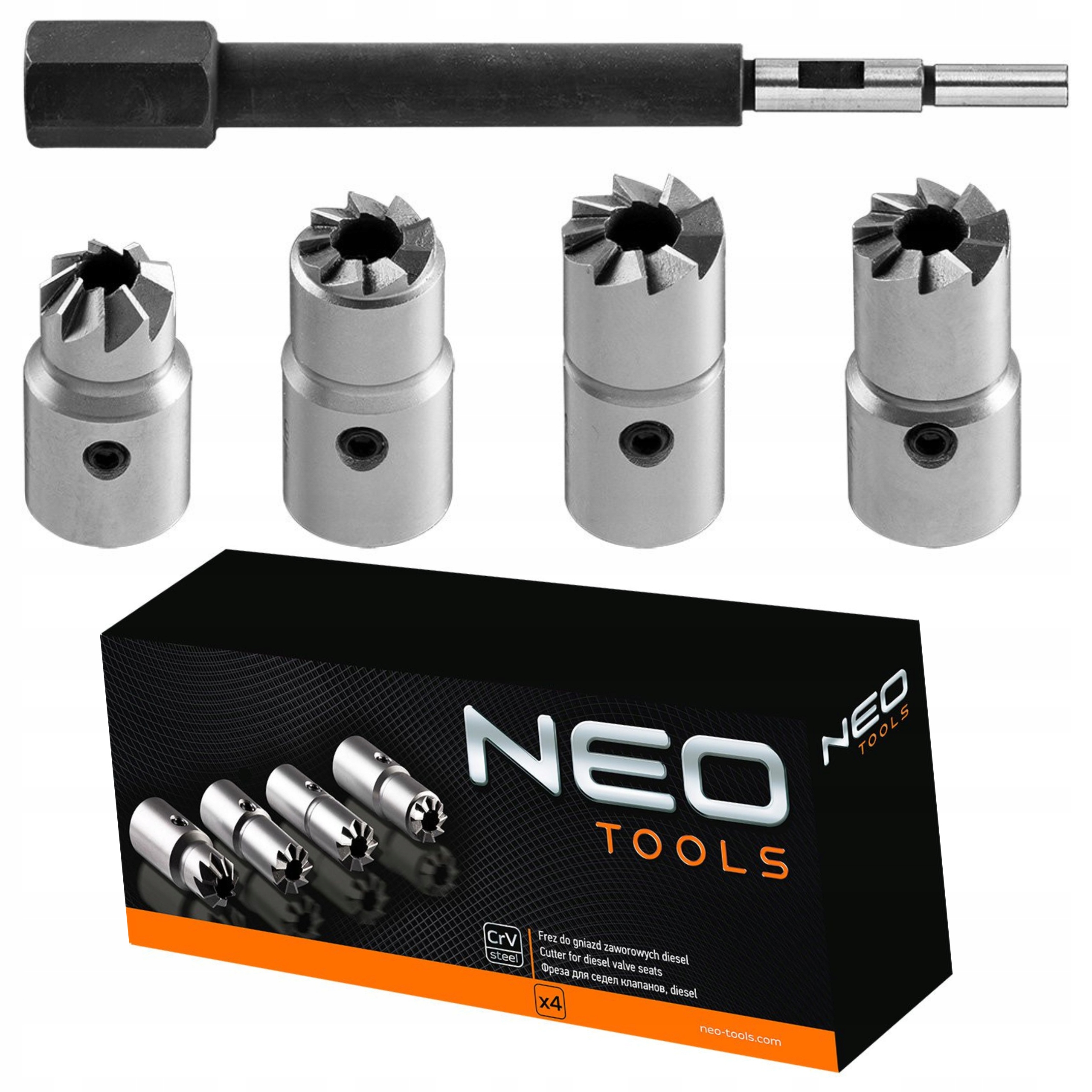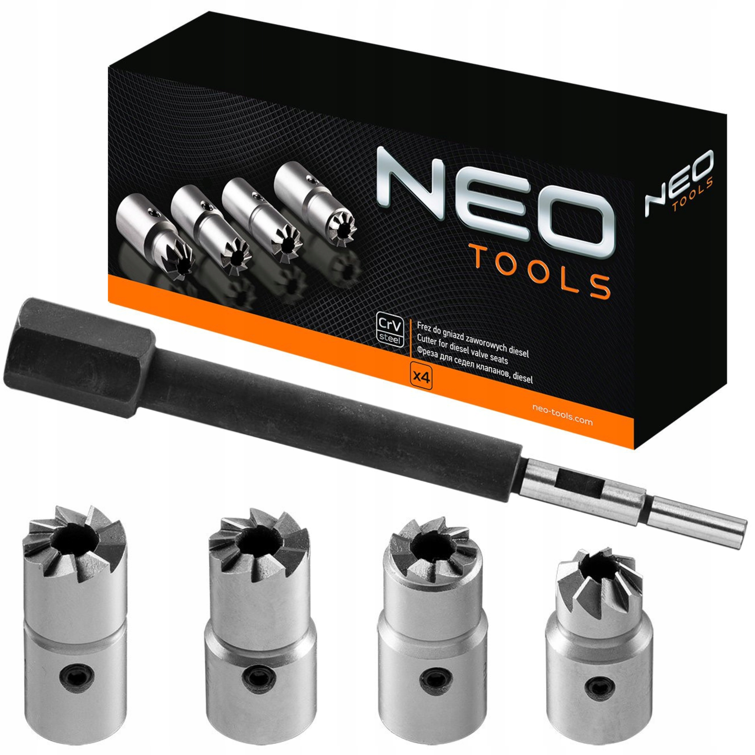 Frez do gniazd zaworowych Diesel NEO zestaw składa się z 4 frezów, (w tym płaski, kątowy, uniwersalny) umożliwiających obróbkę gniazd zaworowych w silnikach Diesla popularnych marek samochodów, takich jak BMW, Mercedes, Renault, Ford. W skład zestawu wchodzi także trzpień pilotujący. Wszystkie elementy wykonane są z wysokiej jakości stali chromowo-wanadowej, gwarantującej wieloletnią trwałość zestawu