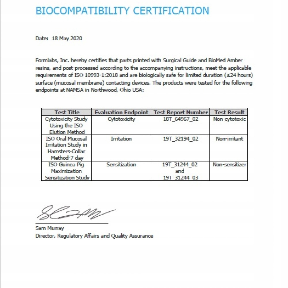 Ten materiał został dokładnie przetestowany i wyprodukowany w czystym pomieszczeniu na własnym sprzęcie Formlabs, który posiada certyfikat ISO 13485, aby zapewnić najlepszą jakość żywicy.