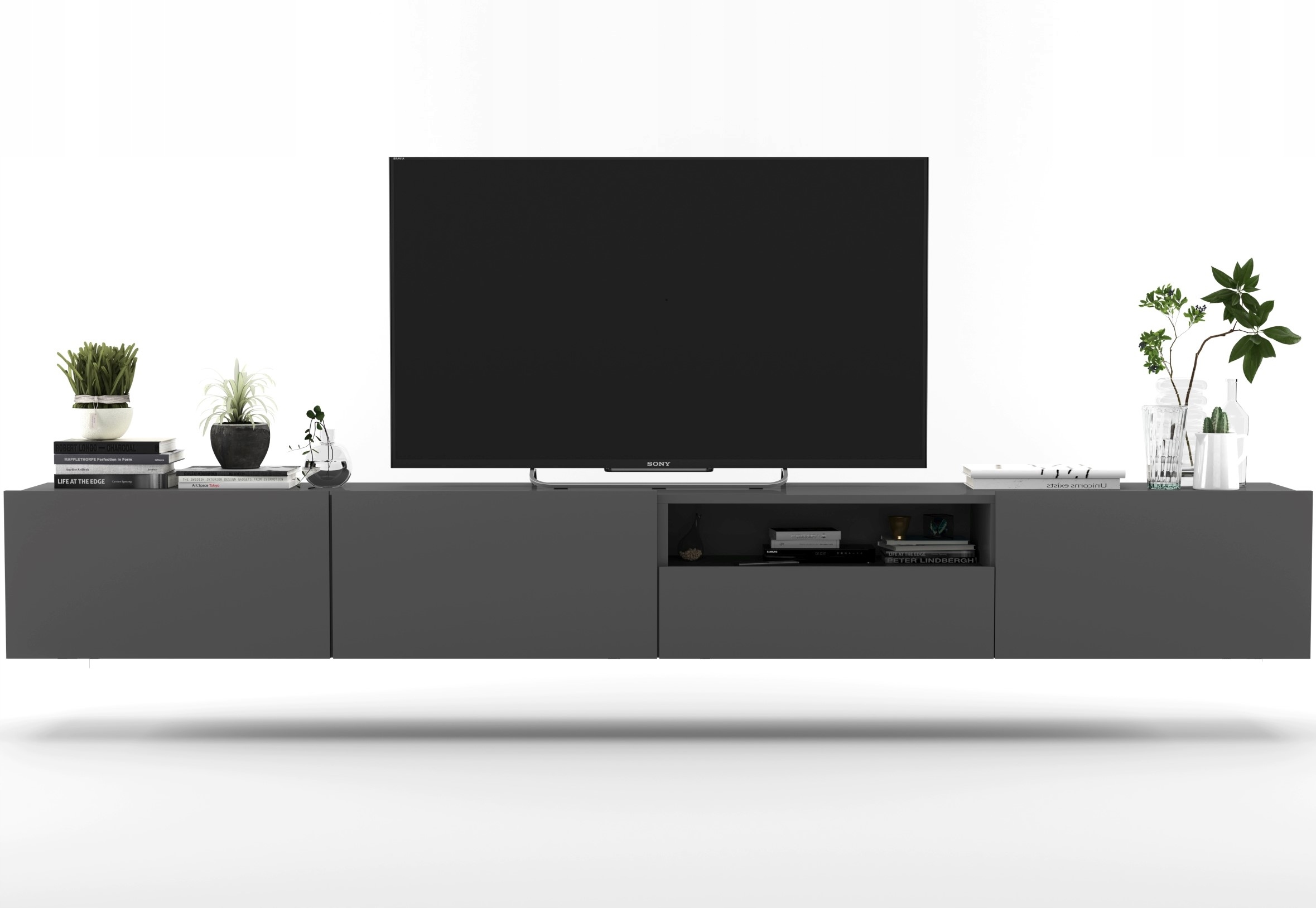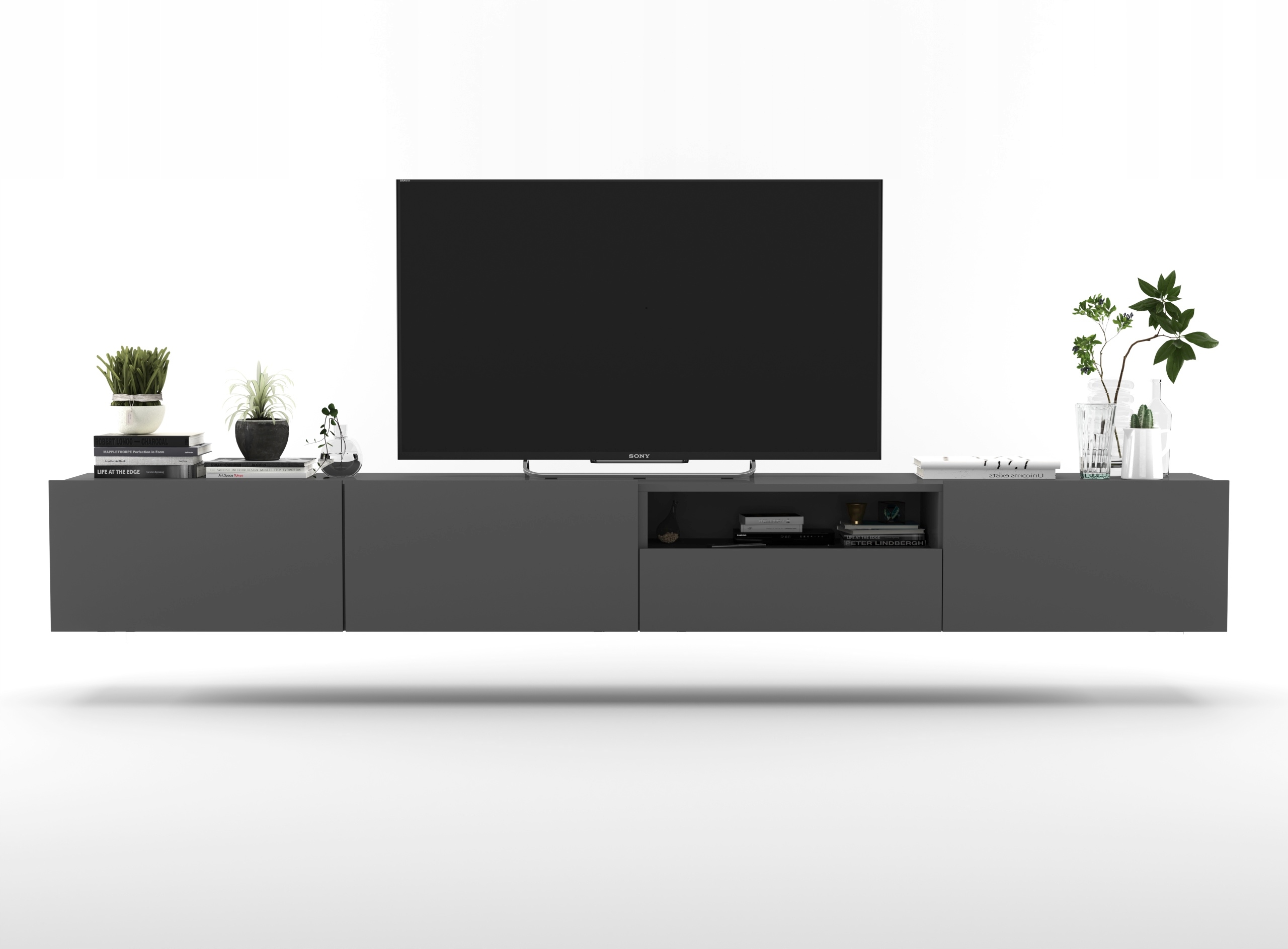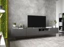 Dwie nowoczesne szafki w kolorze grafit mat, dające łącznie trzy przestronne zamykane komory oraz jedną szufladę. Szafki te są umieszczone obok siebie tworząc jeden długi, bardzo ładnie prezentujący się mebel. Posiadają one drzwiczki uchylne z blokadą ich opadania (do regulacji). Zapewnia to swobodny dostęp do ich wnętrza. Połączenie tych dwóch szafek daje ogromną pojemność tego zestawu.