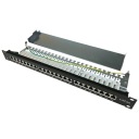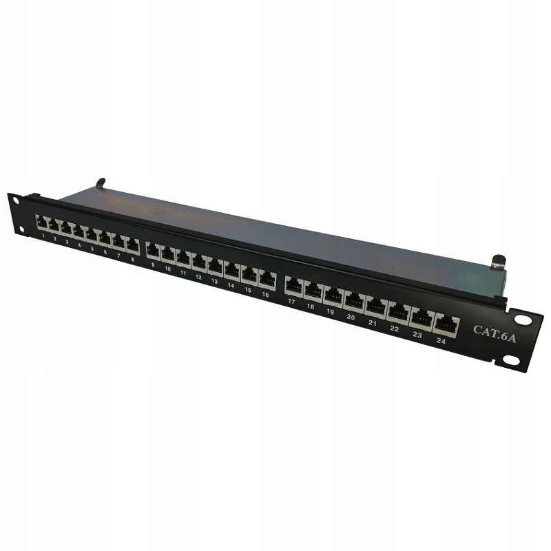 Patch panel (panel krosowy) 24 portowy, ekranowany kategorii 6a, przeznaczony do montażu w szafach rack 19". Pozwala na zakańczanie i organizowanie ekranowanych kabli typu skrętka w instalacjach okablowania strukturalnego.