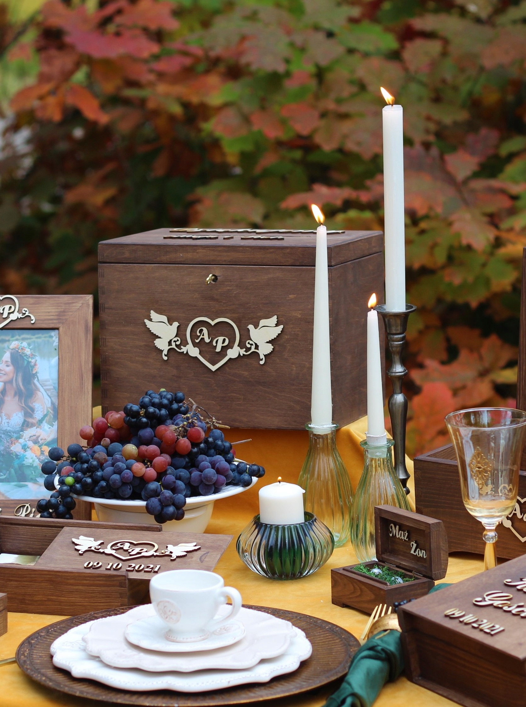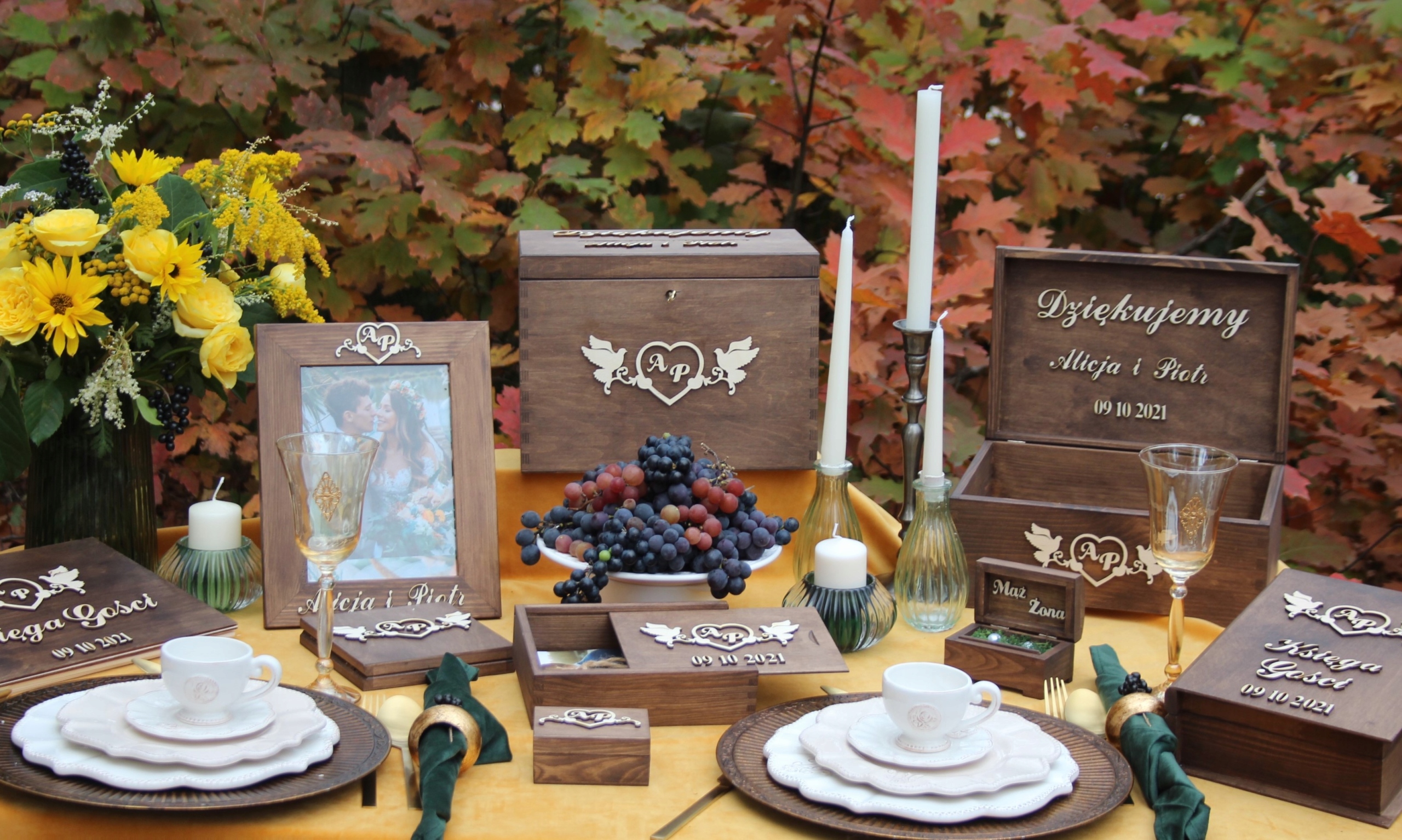 Na górnym wieczku znajduję się napis „ Dziękujemy” oraz imiona nowożeńców. Kartki, koperty wrzuca się od góry poprzez wycięty w skrzyneczce otwór.