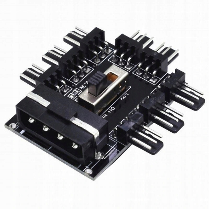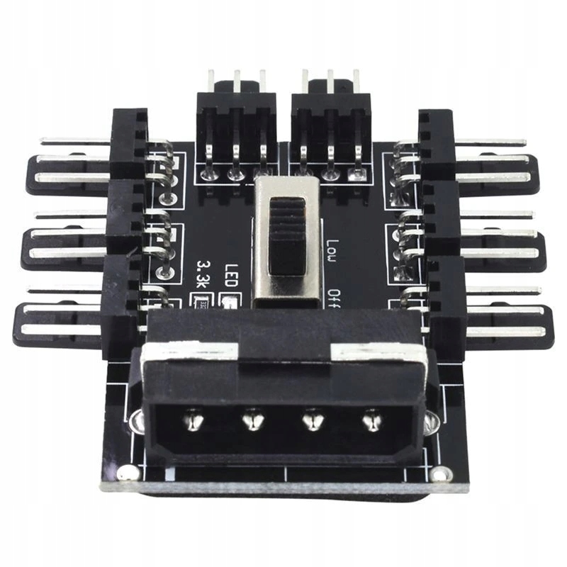 Блистательно подходит для использования в криптовалютных майнерах. Сплиттер имеет 8 разъемов 3 pin позволяет подключать 8 вентиляторов к источнику питания от порта Molex. Przycisk Off / low / high do ручное управление скоростью вентилятора. Светодиодный индикатор работы адаптера. Снизу адаптер имеет клейкую ленту 3M, которая обеспечивает крепление в любом месте.