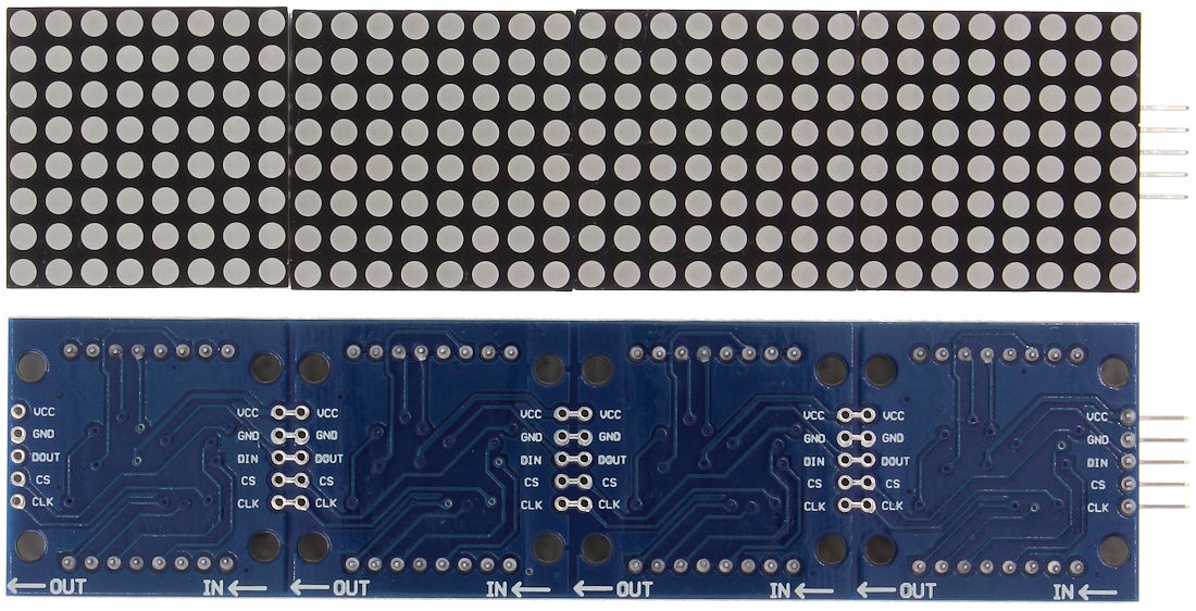 Светодиодный матричный модуль с разрешением 8x32 полей, построен из 4 светодиодных модулей 8x8, управляемых чипом MAX7219. Связь с матрицей происходит через шину SPI. Модуль работает с Arduino и микроконтроллерами AVR. Мартыке можно последовательно объединять в более крупные модули.