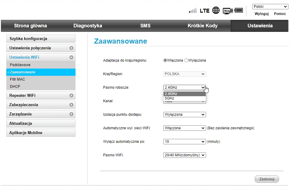 Znajdziesz tu też opcję wymuszenia trybu LTE. Jeżeli masz nielimitowany internet w tym paśmie, to ta opcja będzie bardzo przydatna.