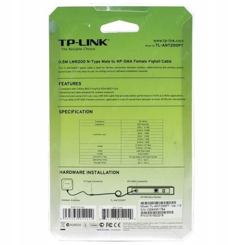 Nazwa produktu TP-Link TL-ANT200PT Pigtail Cable,2.4GHz/5GHz , 0,5m, male N> male RP-SMA