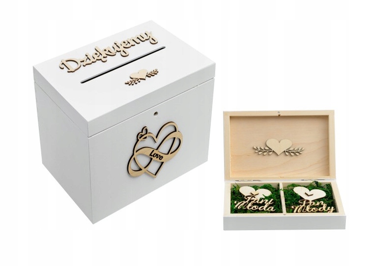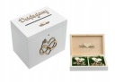 Prezentujemy jedyny w swoim rodzaju zestaw ślubny składający się z zamykanego na kluczyk kufra na koperty oraz gustownego pudełeczka przeznaczonego na obrączki ślubne. Spraw aby Wasz najważniejszy dzień w życiu stał się jeszcze bardziej magiczny z nową, odświeżoną wersją naszych produktów. Dzięki powtarzalnym elementom prezentowany zestaw stanowi komplementarną całość.