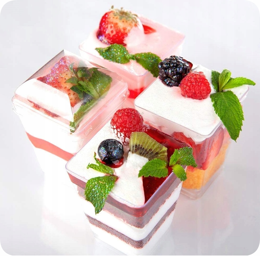 24 sztuki przezroczystych pucharków na desery, idealnych do serwowania zarówno słodkich, jak i słonych przekąsek.