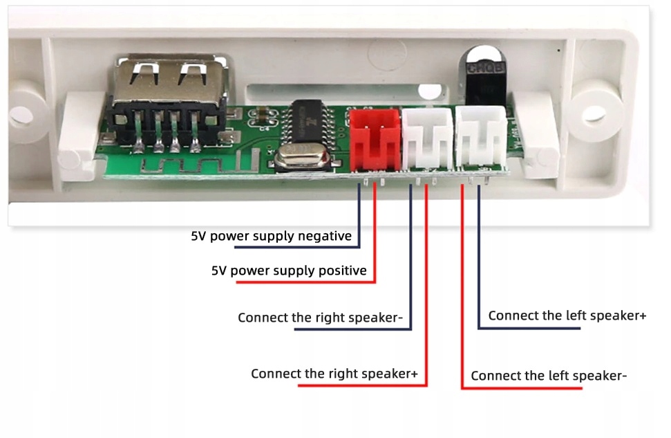 Instrukcja okablowania: podłącz biały zacisk do głośnika i czerwony zacisk do zasilania