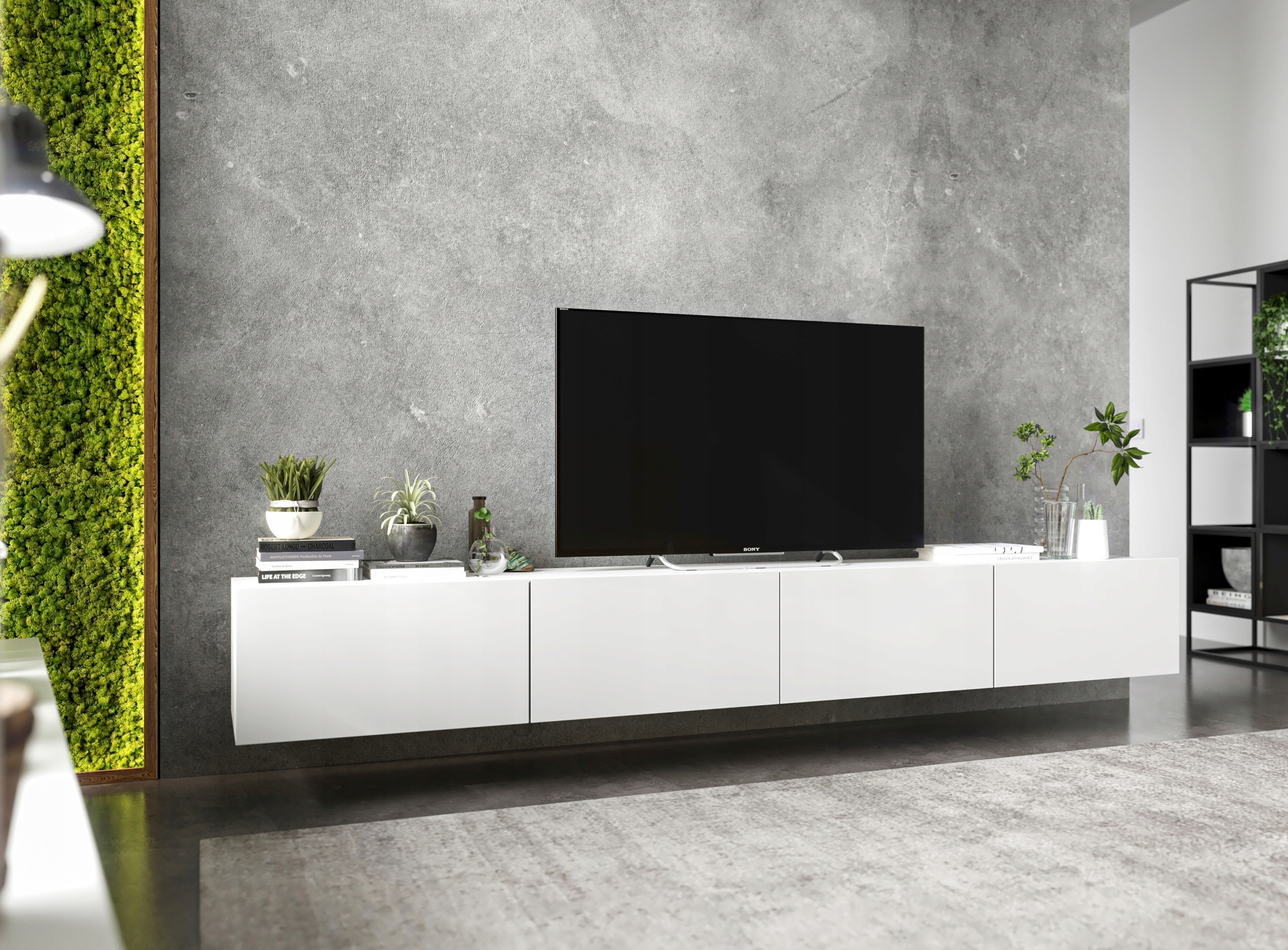 Два современных шкафа белого матового цвета, имеют всего четыре просторных запираемых отсека. Эти шкафы расположены рядом друг с другом, образуя один длинный, очень красивый предмет мебели. Они имеют откидные двери с блокировкой их падения (для регулировки). Это обеспечивает свободный доступ к их интерьеру. Сочетание этих двух шкафов дает огромная емкость этого комплекта. Удобное безрукавное открытие фасадов придает ей элегантный вид вид.