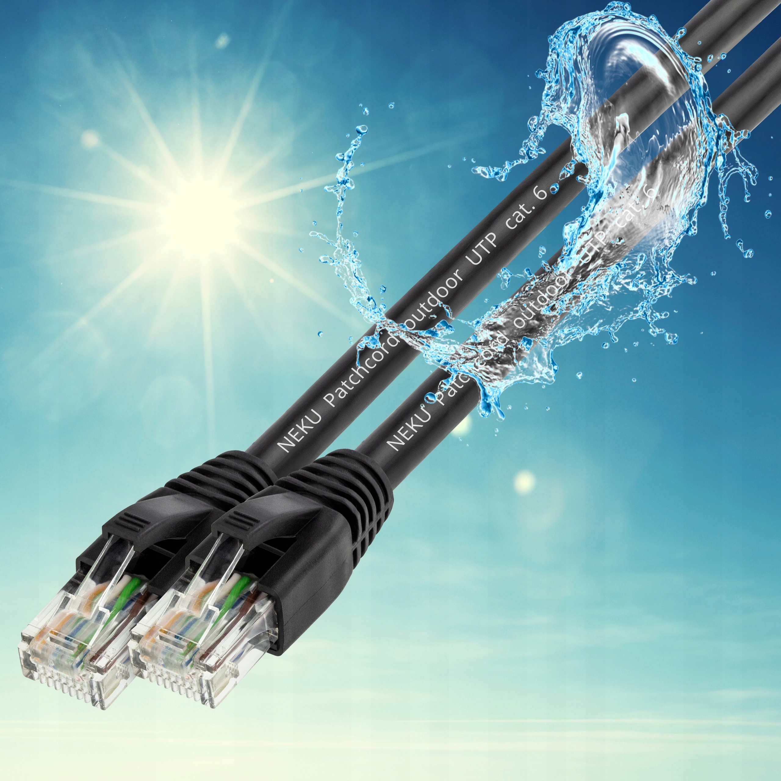Przewód w połączeniu prostym 1:1, z grubą, 4-parową skrętką AWG 24 wykonaną z miedzi. Wyposażony w podwójną powłokę odporną na promieniowanie UV, korozję oraz wodę. Wtyki RJ45 po obu stronach, chronione przez osłonkę z elastyczną odgiętką zapobiegającą uszkodzeniom kabla.
