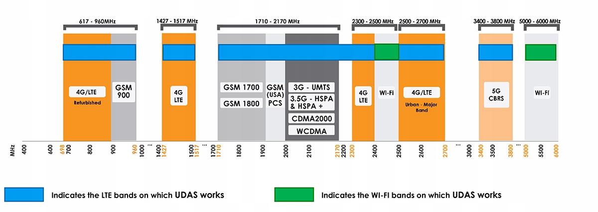 UDAS to antena dookólna działająca w zakresie 617–960 MHz, 1427-1517 MHz, 1710-2700 MHz, 3400-3800 MHz oraz w pasmach częstotliwości Wi-Fi 2400-2500 MHz i 5000-6000 MHz