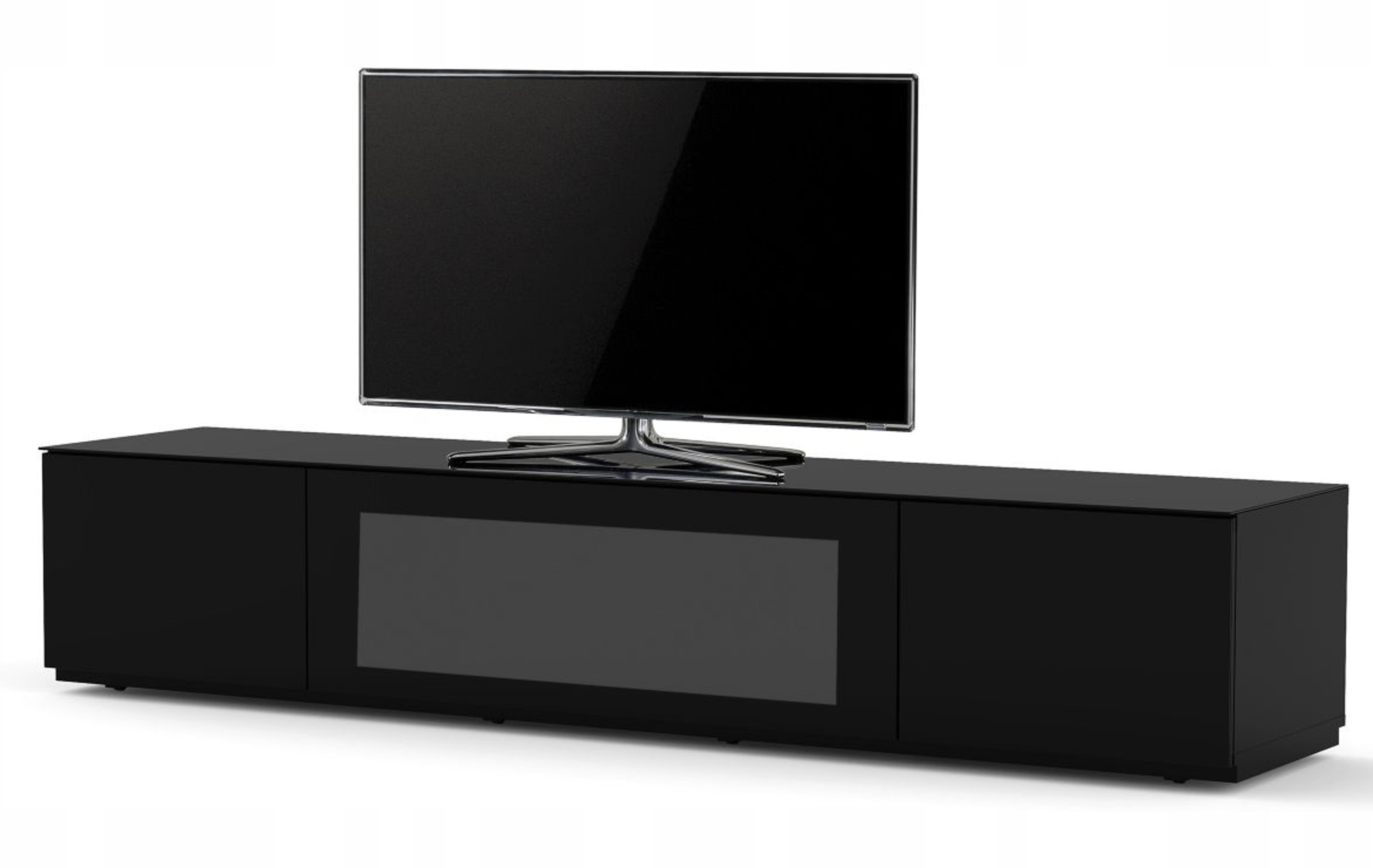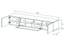 Dzięki temu zarówno otwieranie, jak i zamykanie jest ciche i dyskretne. Takie rozwiązanie pozwala na całkowite pozbawienie szafki uchwytów, przez co nadaje jej elegancji oraz ułatwia utrzymanie szafki w czystości. Dolna część szafki wykończona została cokołem, który nadaje szafce elegancji i jednocześnie ukrywa schowane w nim rolki (kółka), umożliwiające swobodne przemieszczenie szafki. Szerokość 200 cm, przeznaczona do telewizorów o przekątnej do 90 cali.