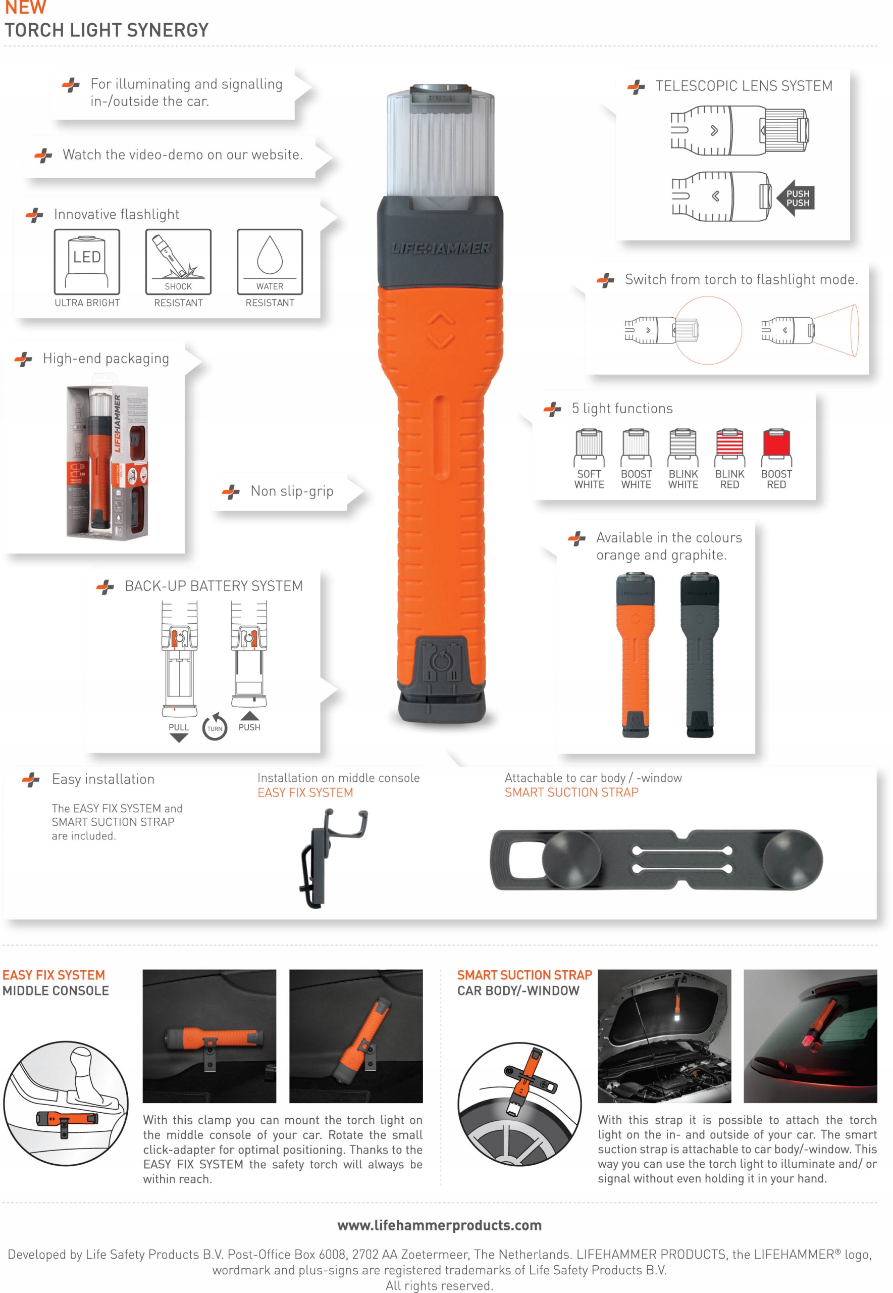 Lampka bezpieczeństwa safety torch jest innowacyjnym produktem do waszego auta. Latarka oferuje pięć różnych rodzajów oświetlenia we dwóch barwach. Zestaw zawiera dwa uchwyty. Jeden do zamontowania wewnątrz panelu samochodu, także zawsze będziecie mieli go pod ręką. Drugi uchwyt jest wyposażony w przyssawki, dzięki którym możecie umieścić latarkę na szybie lub karoserii auta.