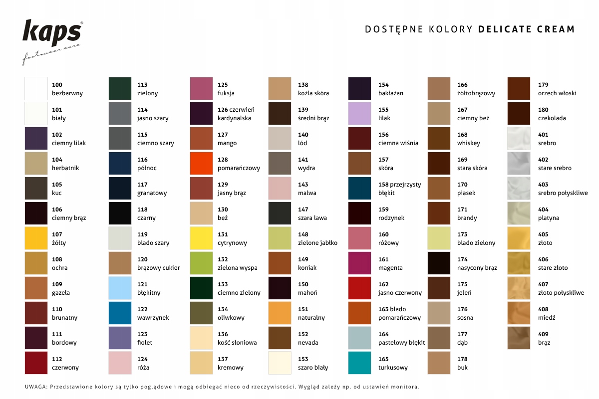 Pasta do butów Kaps Delicate Cream ma postać kremu stworzonego na bazie naturalnych wosków. Czyści pielęgnuje, odżywia, nadaje skórze połysk i odnawia kolor. Sprawdza się idealnie zarówno do skór naturalnych jak i syntetycznych. Pasta do butów Kaps wyprodukowana została z myślą, by przywrócić obuwiu jego naturalny kolor.