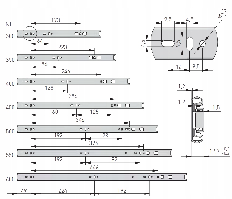 *dla długości 300, 350 oraz 400 mm nie występuje pełny wysuw.