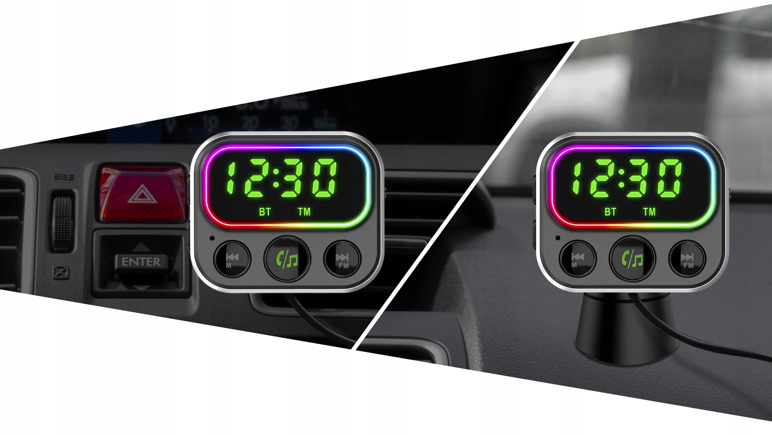Устройство было разделено на 2 части для большего удобства использование. Зарядное устройство подключается к прикуривателю, а функциональный дисплей можно подключить к вентиляционной решетке или с помощью дополнительной подставки прикрепить к доске приборная панель автомобиля.