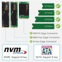 Dysk posiada po 1 złączu na dany interfejs dysku. Dysk M.2 SATA należy podłączyć kablem SATA 7 pin z płytą główną (w zestawie), dysk M.2 NVMe łączy się z płytą główną przez złącze PCI-E x16 w adapterze, dysk mSATA należy podłączyć kablem SATA 7 pin z płytą główną (w zestawie). 3 dyski są podłączone do płyty głównej w różny sposób, dzięki temu mogą działać 3 jednocześnie zajmując tylko 1 miejsce w obudowie i 1 złącze PCI-E na płycie głównej.