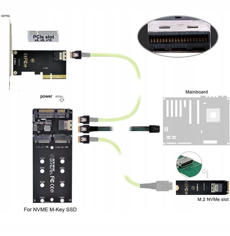 Kontroler posiada po 1 złączu na dany interfejs dysku M.2. Dysk M.2 SATA i dysk M.2 PCI-e NVMe. Dwa dyski są podłączone do płyty głównej w różny sposób, dzięki temu mogą działać 2 jednocześnie zajmując tylko 1 miejsce w obudowie.