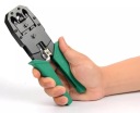 Zaciskarka do wtyków modularnych typów: 8P8C/RJ45, 6P6C/RJ12, 6P4C/RJ11. Wyposażona została w specjalne wymienne ostrza, ściągacz izolacji oraz dźwignię, która równomiernie rozkłada siłę docisku, dzięki czemu możemy dokładnie zarabiać nasze kable. W przeciwieństwie do innych modeli w tym dźwignia zaciskarki doczołowej porusza się pionowo co znacznie wpływa na precyzyjność i jakość wykonywanej pracy.