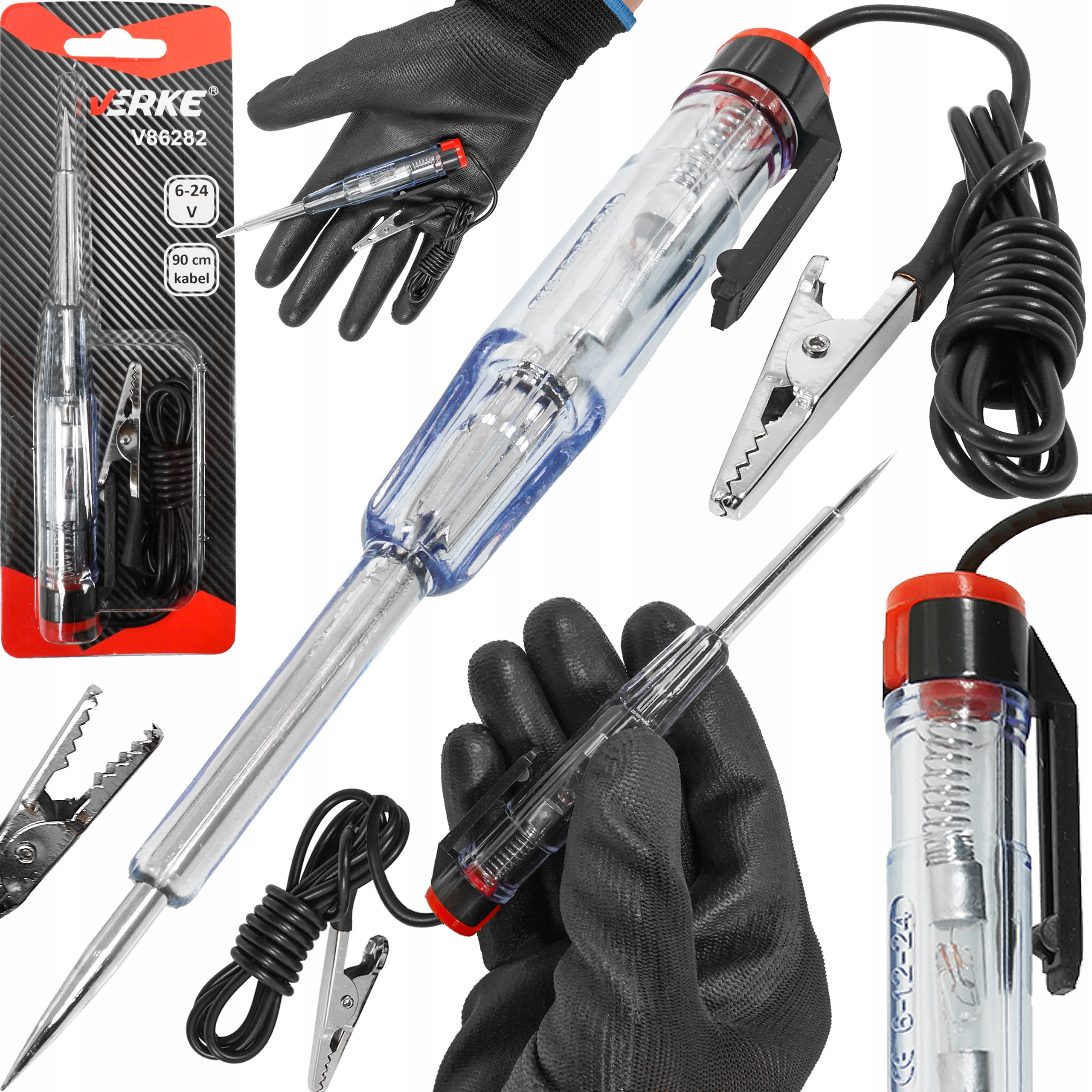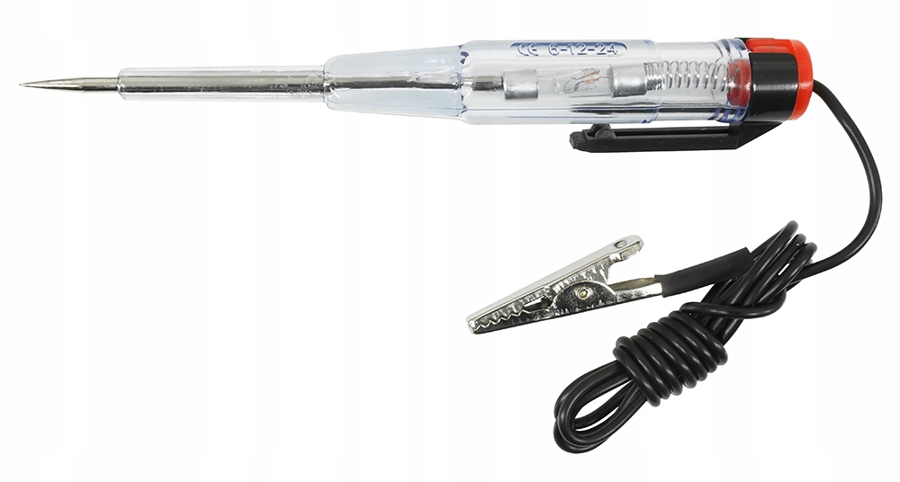 Samochodowy próbnik napięcia wyposażony w diodę LED. Zakres pomiarowy od 6 V do 24 V. Długość kabla 90 cm.