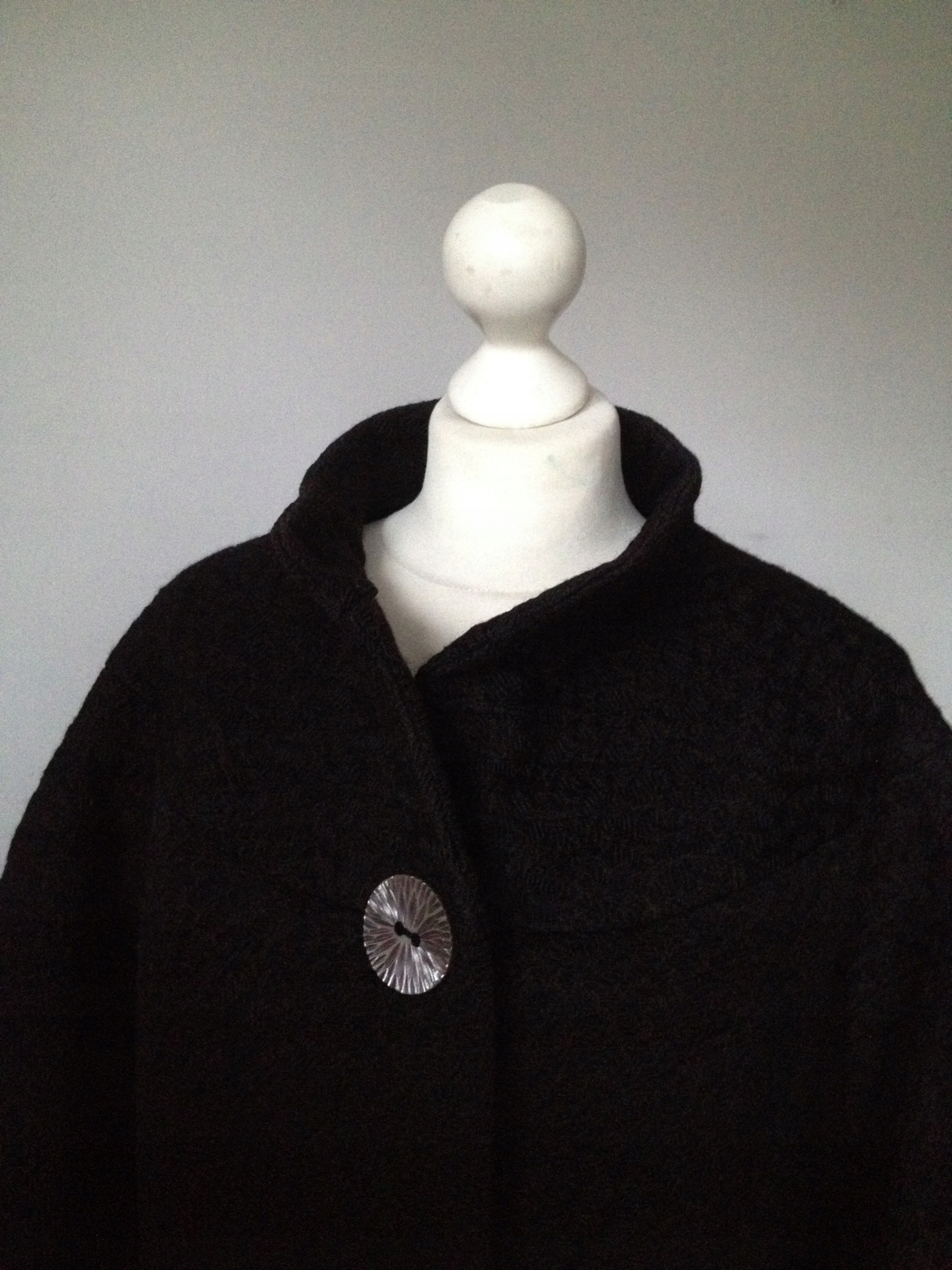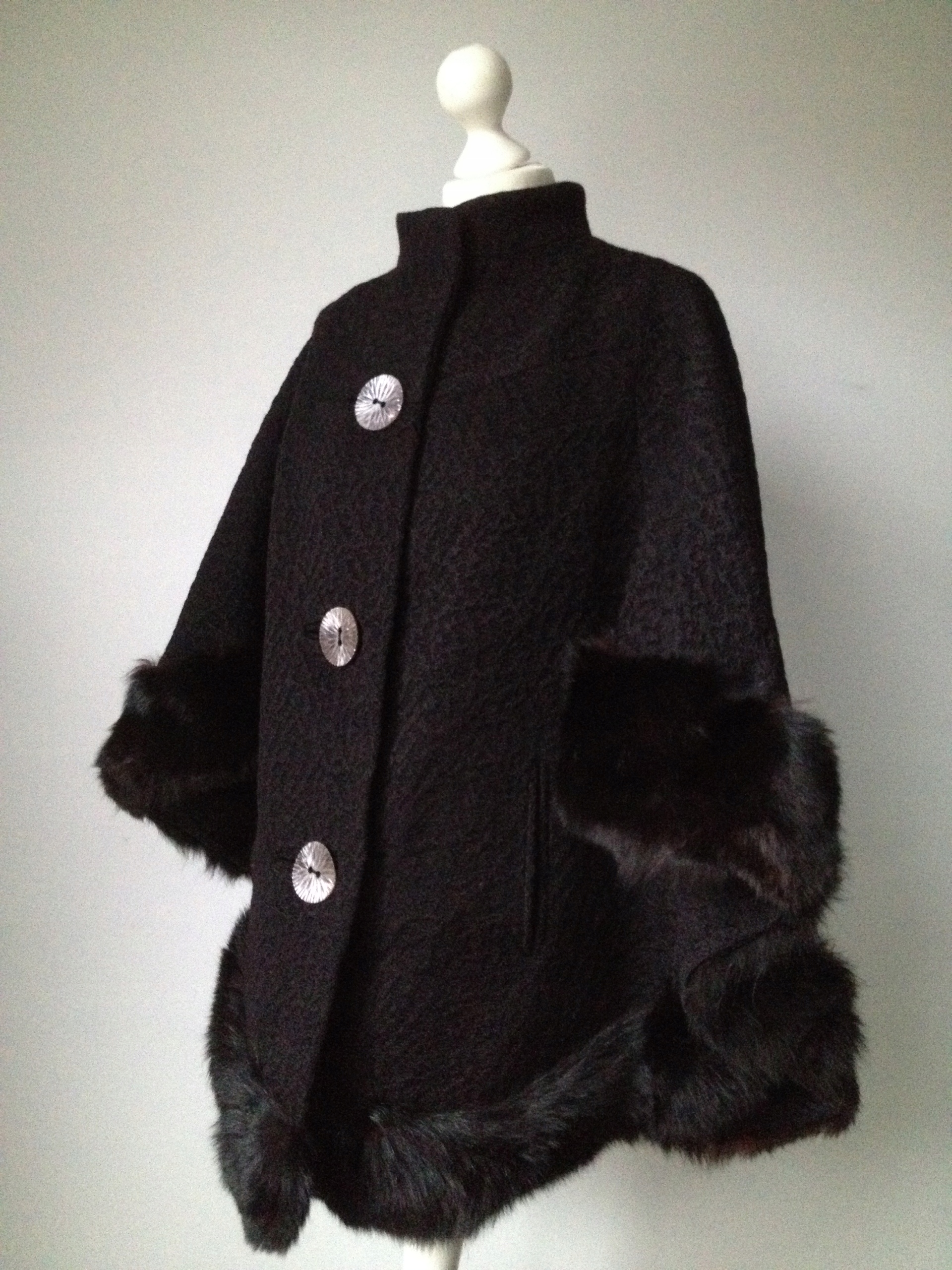 Po bokach zapinane na duże dekoracyjne guziki - można je odpiąć i wtedy jest klasyczne, luźne ponczo.
