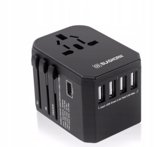 • Wbudowane 4 gniazda USB oraz USB C, pozwalają ładować jednocześnie aż 5 różnorodnych urządzeń na raz takich jak Smartphone, Power Bank, Tablet, PDA, iPod, MP3, Aparat prawie na całym świecie. Całkowita moc wynosi max. 5.6A.
