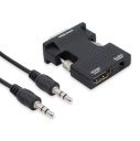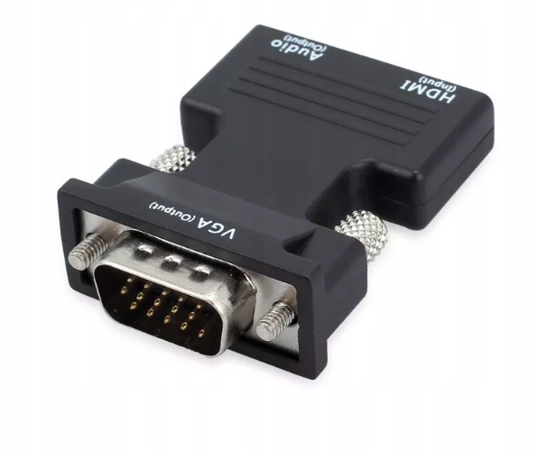 Adapter konwertuje cyfrowy sygnał HDMI do sygnału analogowego VGA plus dźwięk audio ( podawany przez kabel Jack )