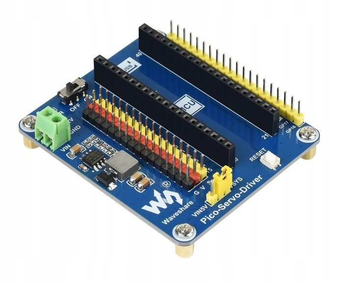 Moduł do sterowania serwomechanizmami przeznaczony do współpracy z Raspberry Pi Pico. Wykorzystuje wyjścia PWM mikrokontrolera i ma wyprowadzone 16 złącz 3-pinowych kompatybilnych z interfejsem stosowanym w serwach. Moduł wyposażony został w złącze z pozostałymi pinami Pico pozwalające na podłączenie dodatkowych elementów. Na płytce znajduje się przetwornica 5 V o wydajności 3 A. Serwa mogą być zasilane przez złącze USB podłączanie do Raspberry Pi Pico lub przez złącze śrubowe napięciem z zakresu od 6 do 12 V. Sprawdzi się w projektach wykorzystujacych dużą ilość serw modelarskich np. przy budowie robota kroczącego lub manipulatora. Pełna dokumentacja wraz z przykładami dostępna jest na stronie Wiki produktu.