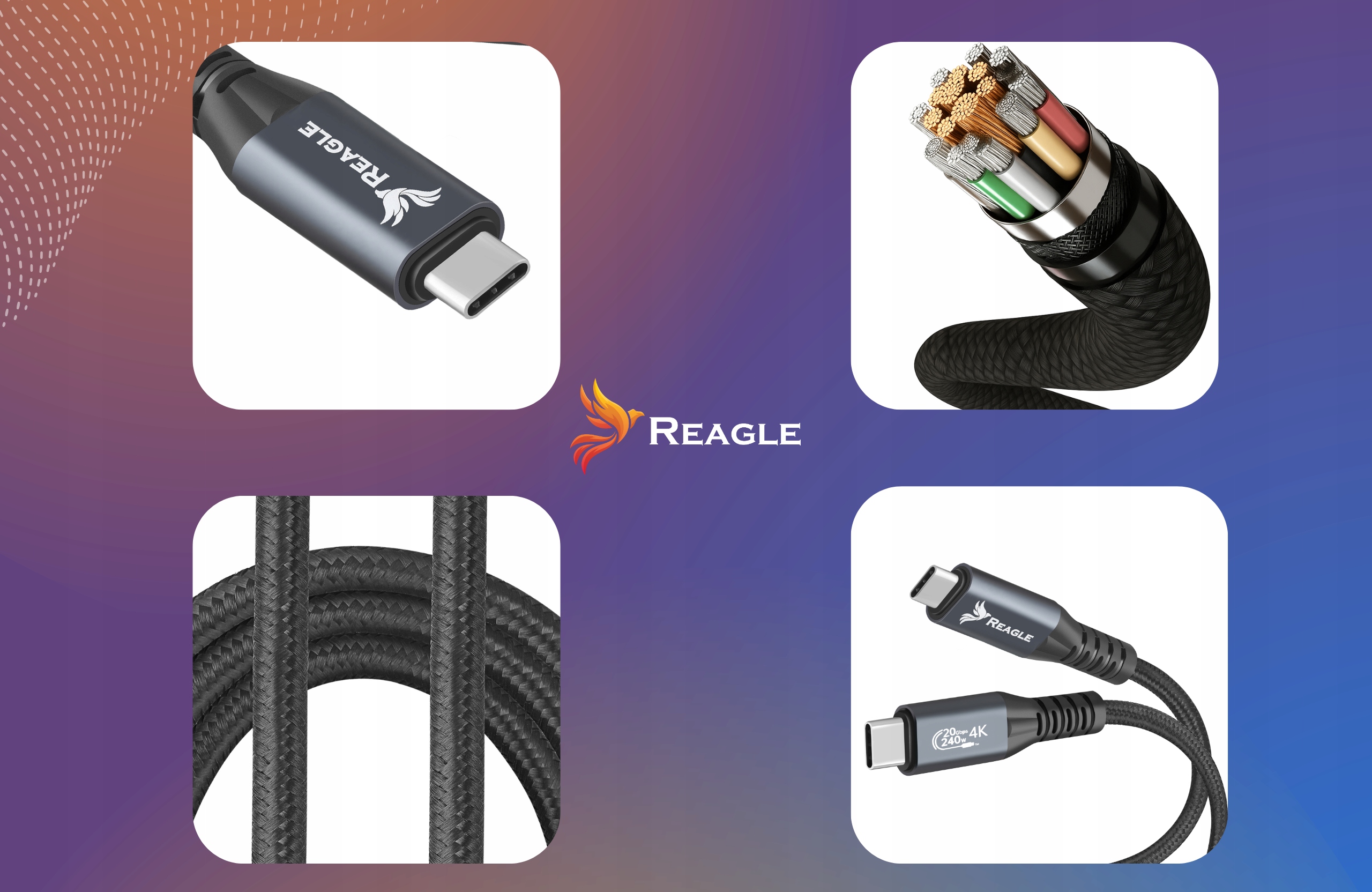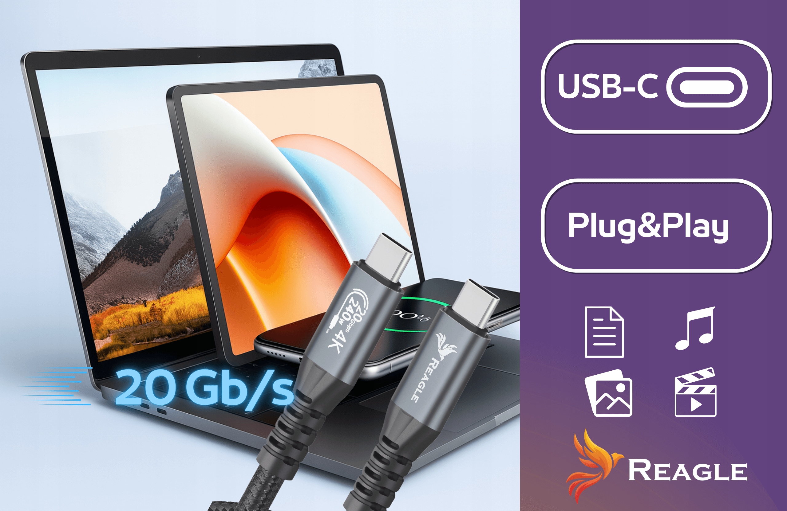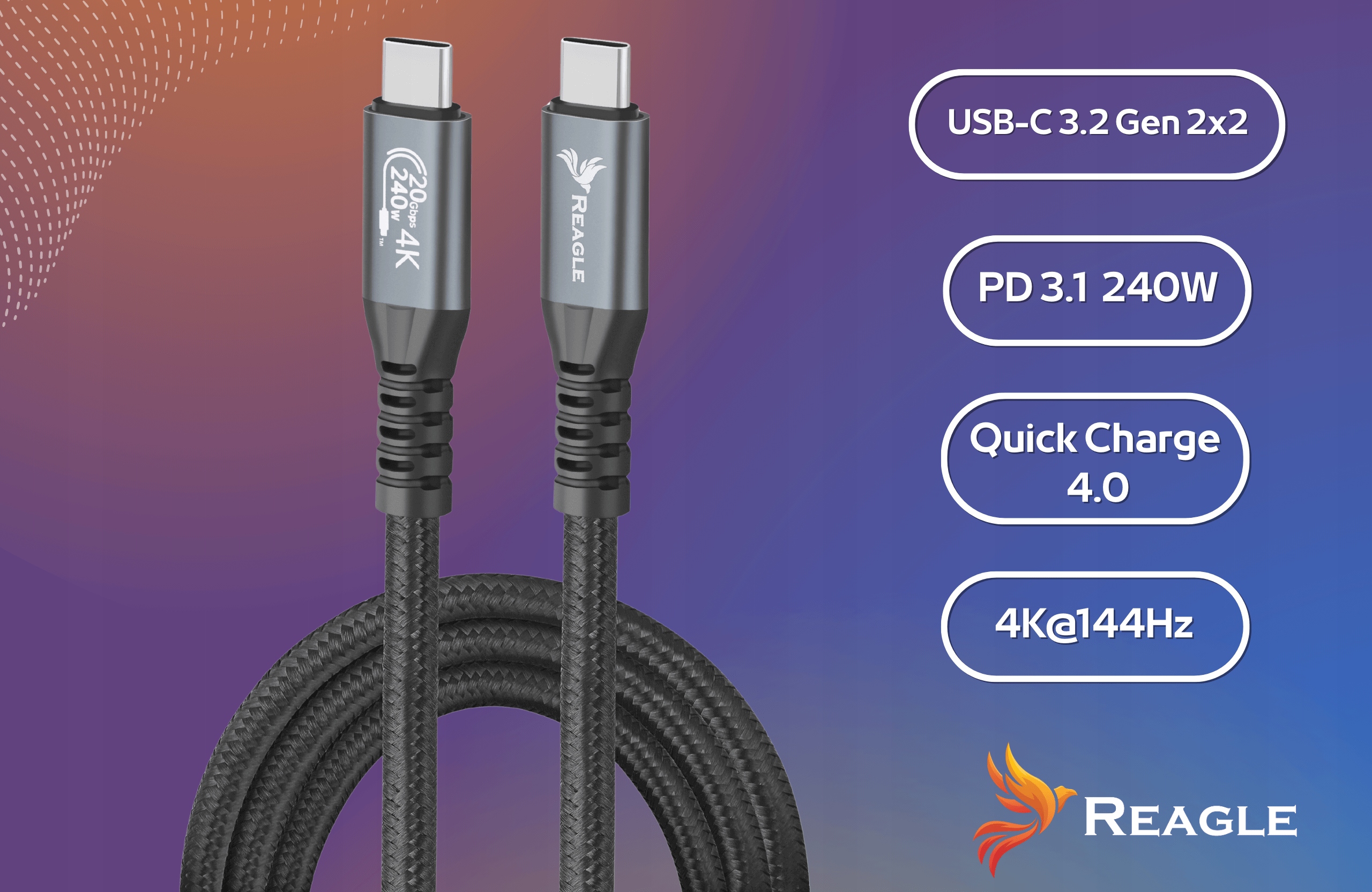 Model RUC300M od marki Reagle to nowoczesny kabel USB-C do USB-C, który oferuje nie tylko superszybki przesył danych i ładowanie, ale również obsługę obrazu 4K@144 Hz. Dzięki przepustowości do 20 Gb/s oraz Power Delivery 240W, sprawdzi się w domu, biurze i podróży.