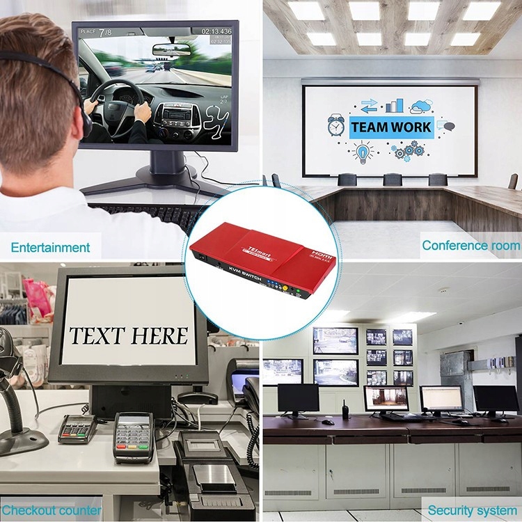 Przełącznik obsługuje hub USB 2.0 oraz klawiaturę / mysz USB 2.0. Korzystając z portów koncentratora USB 2.0 w KVM, możesz nawet podłączyć dysk USB, drukarkę, skaner kodów kreskowych lub inne urządzenia USB do KVM. Przełączaniem można sterować za pomocą różnych metod, takich jak przyciski wyboru źródła na panelu przednim, sygnały IR i klawisze skrótu na klawiaturze.