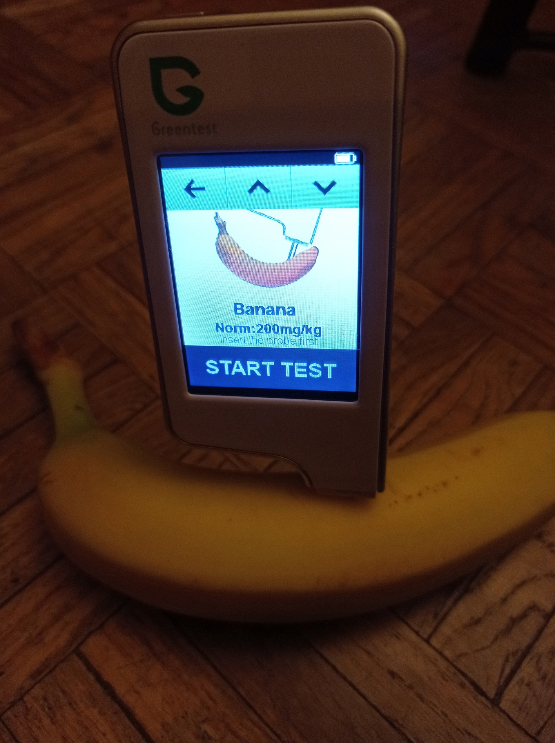 Na zdjęciu pokazane na bananie jak się wkłuć i widać wyniki pomiaru . Ten Banan można zjeść !! Przeszedł test ( banan z Biedronki )