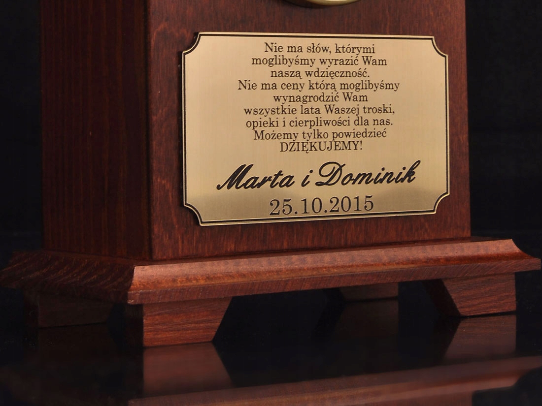Piękny, drewniany zegar ze złotymi lub srebrnymi blaszkami wykonany w stylu "RETRO" to jeden z najlepszych prezentów na urodziny, imieniny, wręczany rodzicom i chrzestnym w dniu ślubu jak również w przypadku innych okazji. To idealny prezent na wszelakie okazje. Z pewnością będzie perfekcyjnie prezentował się na komodzie lub witrynie. Od tej pory będzie nierozłącznym elementem wszystkich uroczystości odbywających się w domu. Dodatkową jego zaletą jest to, że wcale nie musi być takim stereotypowym podarunkiem powiązanym z uroczystością urodzinową lub imieninową. Możliwość nadania mu dowolnego posrebrzanego, czy też pozłacanego grawerunku czyni z niego idealny podarek.