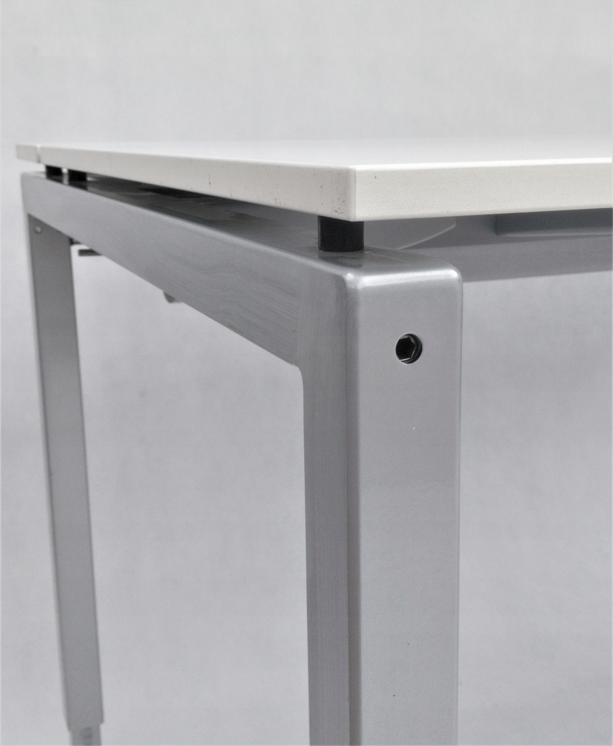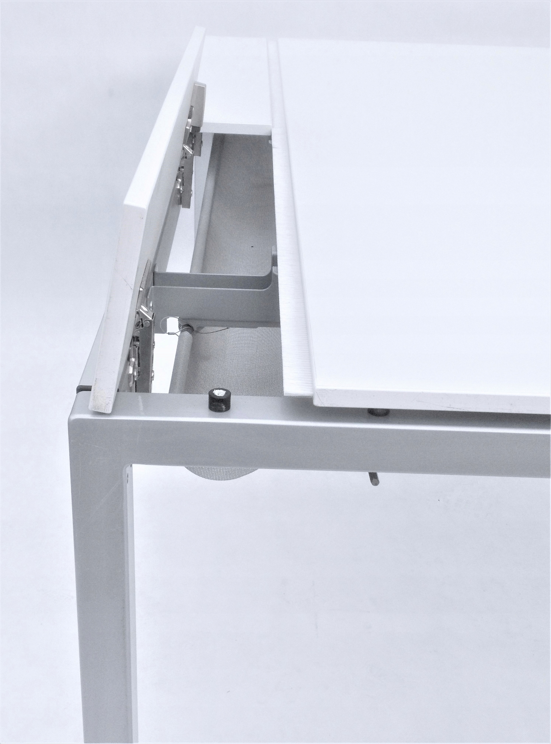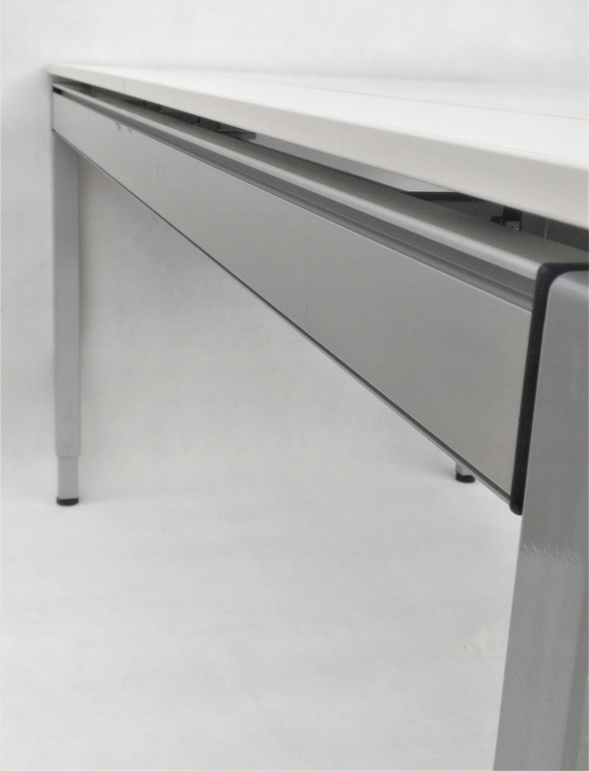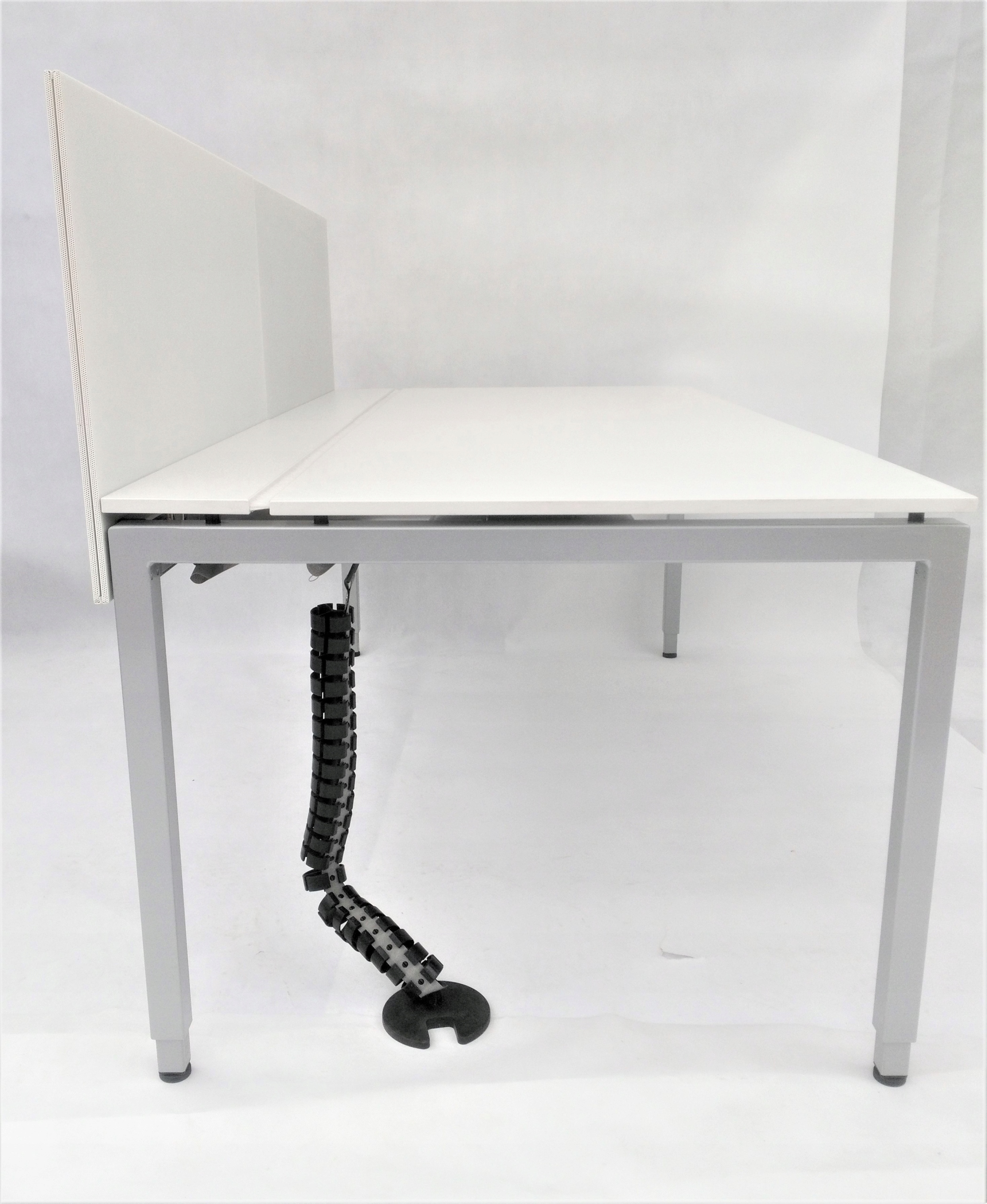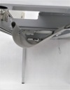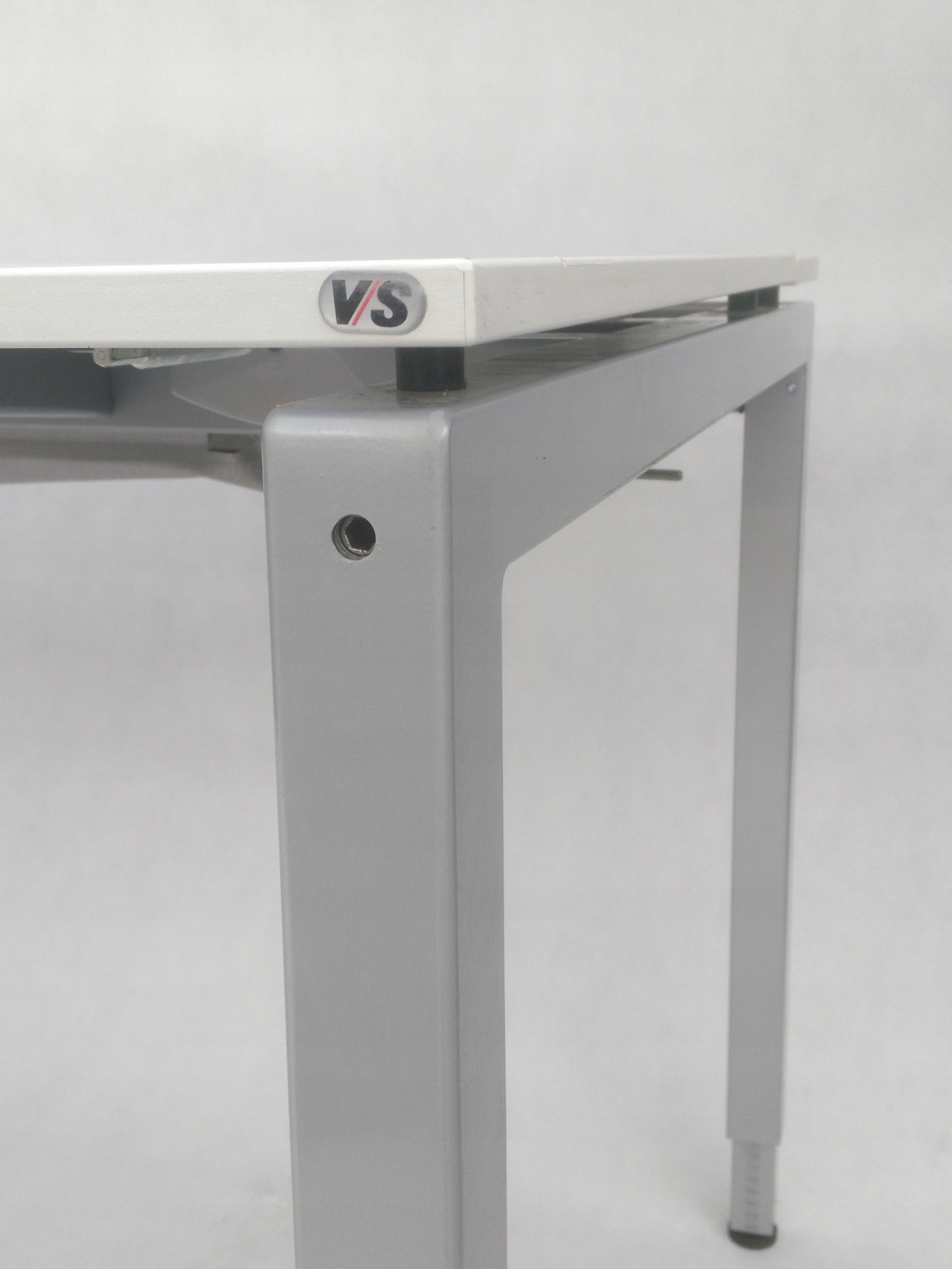 Biurko niemieckiej firmy VS to połączenie prostego designu i wysokiej jakości materiałów. Blat składa się z trzech elementów - głównej płyty i dwóch mniejszych, otwieranych. Zastosowane rozwiązanie umożliwia wygodne ułożenie przewodów. Specjalna maskownica w formie szczotek pozwala na wyciągnięcie kabli w dowolnym miejscu. Pod blatem znajduje się materiałowy uchwyt, prowadnica na kable, dzięki czemu zachowanie porządku jest znacznie łatwiejsze. Biurko zostało wyposażone w nogi wkręcane w metalowy stelaż, posiadające możliwość regulacji aby zapewnić pełną stabilność mebla. Wysokość biurka jest regulowana, co pozwala na wygodną pracę zarówno niskim, jak i wysokim osobom.