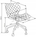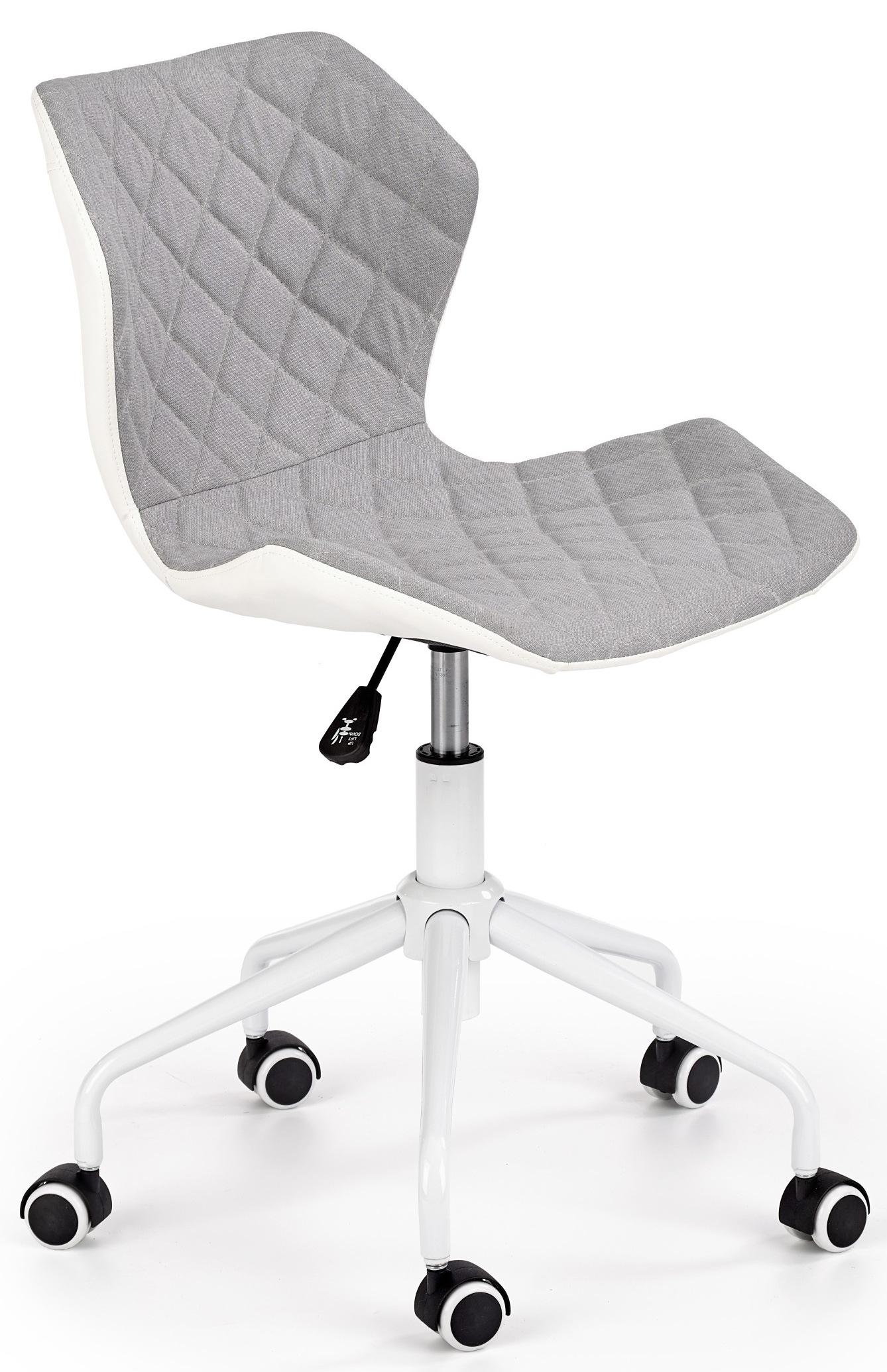 Atrakcyjny obrotowy fotel młodzieżowy. Front siedziska tapicerowany jasną szarą pikowaną tkaniną, tył białą eco skórą. Podstawa jezdna wykonana z metalu w kolorze białym. Mechanizm umożliwia regulację wysokości siedziska.